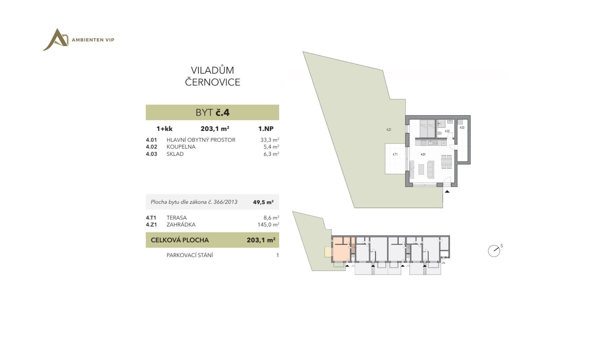 Ambienten VIP si Vám dovoluje nabídnout ve výhradním zastoupení majitele prodej bytové jednotky o dispozici 1+kk s terasou, zahradou a venkovním parkovacím stáním v nově postaveném luxusním viladomě na Faměrově náměstí v městské části Brno – Černovice. Bytová jednotka se nachází v 1. nadzemním podlaží a její podlahová plocha činí 49,50 m². S terasou o velikosti 8,6 m² a zahradou o rozloze 145,0 m² se celková užitná plocha rozšiřuje na 203,1 m².
