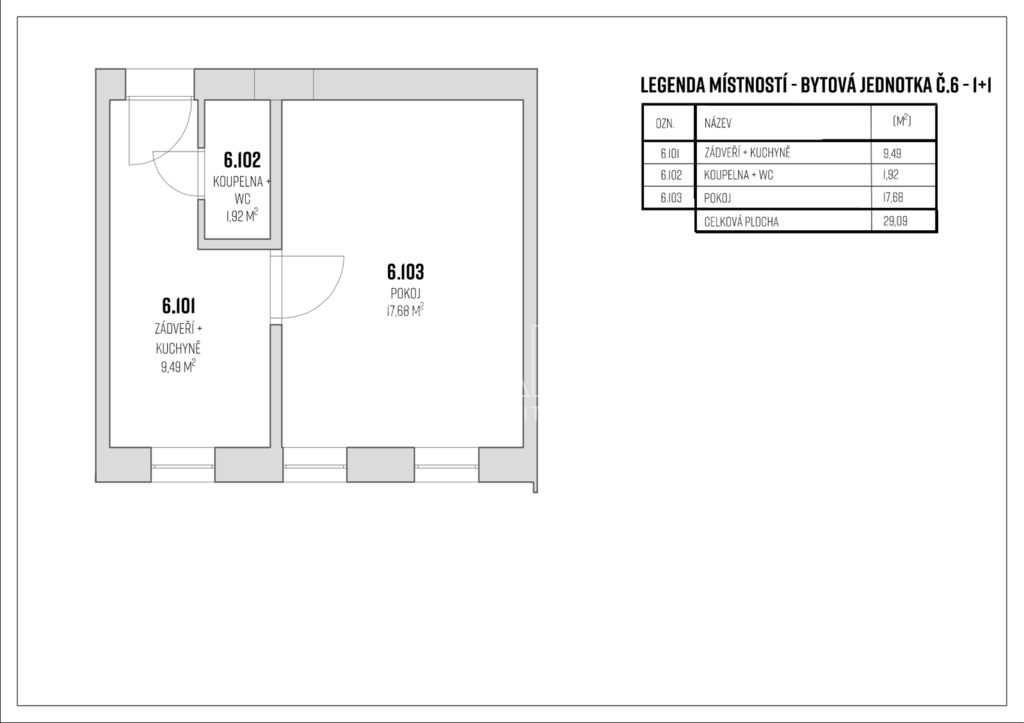 Byt se nachází ve 3. nadzemním podlaží a jeho celková užitná plocha je 29 m². K bytu dále náleží sklepní kóje o výměře cca 4,9 m². Orientace oken na západní stranu.