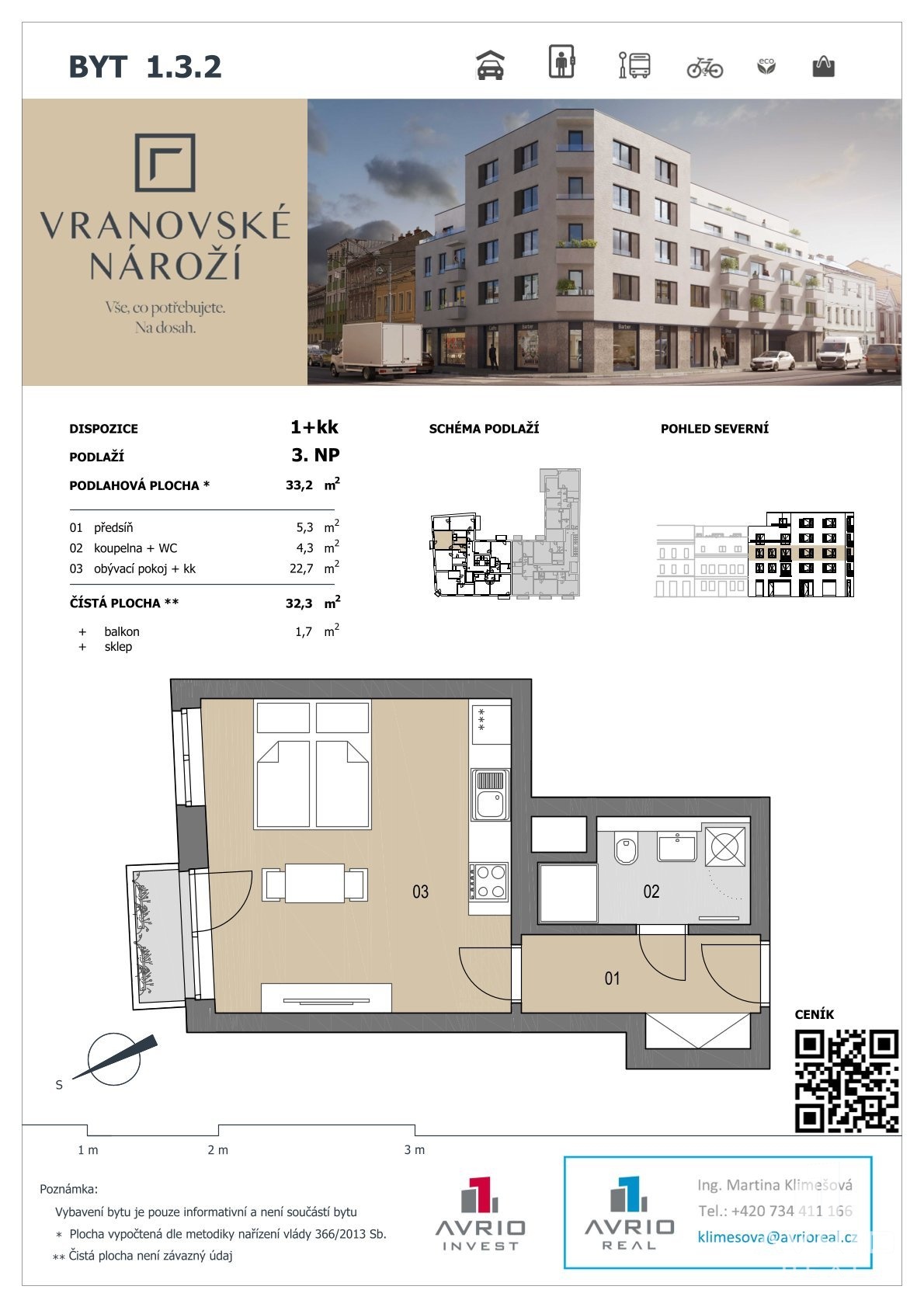 Představujeme Vám byt o dispozici 1+kk a výměře 32,3 m2 v projektu Vranovské nároží.