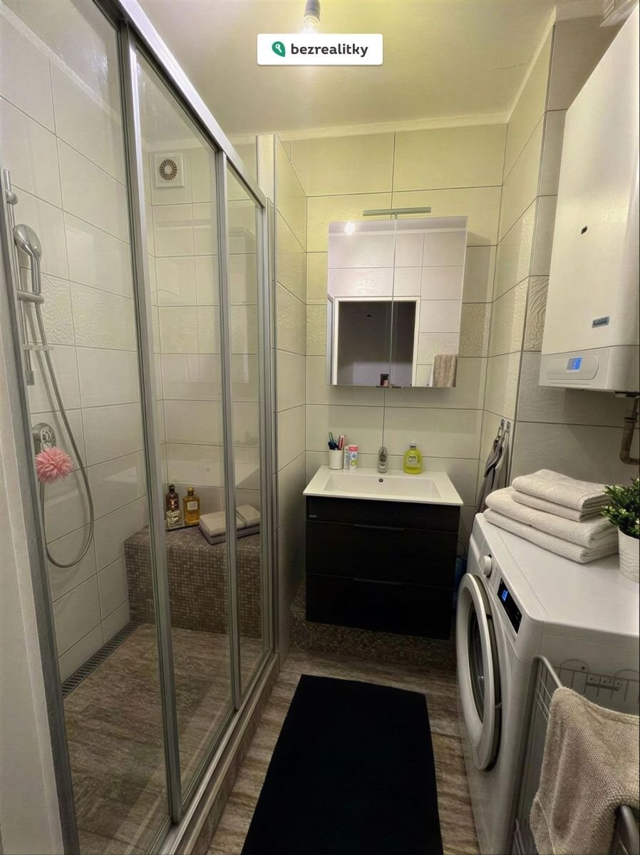 Koupelna se sprchovým koutem, umyvadlem, kotlem. WC je samostatné. Obojí s moderními obklady.