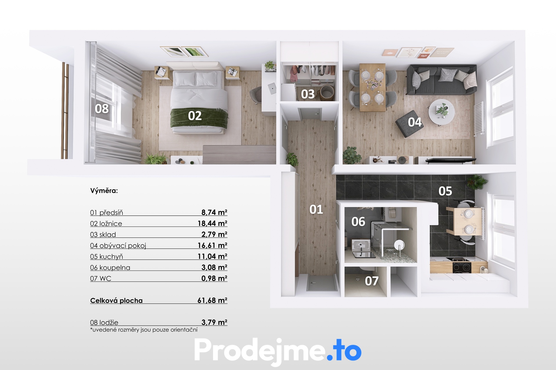 Byt sestává z prostorné předsíně s místem pro vestavěnou skříň, kuchyně s přípravou na kuchyňskou linku, pokoje, ložnice se vstupem na lodžii, koupelny se sprchovým koutem a samostatného WC se závěsnou toaletou. Jistě oceníte také praktickou komoru o velikosti 2,79 m2, která může posloužit i jako šatna. Skladovací prostory zajišťuje sklepní kóje. K využití je i společná kočárkárna s kolárnou.