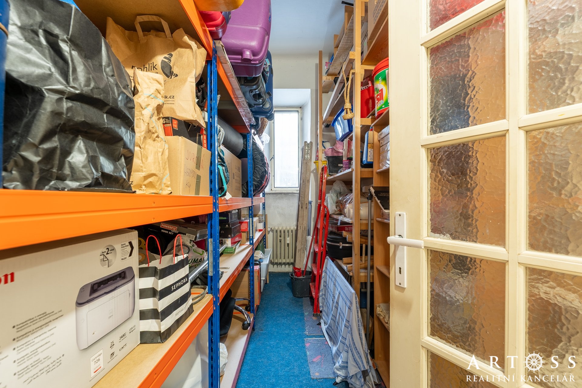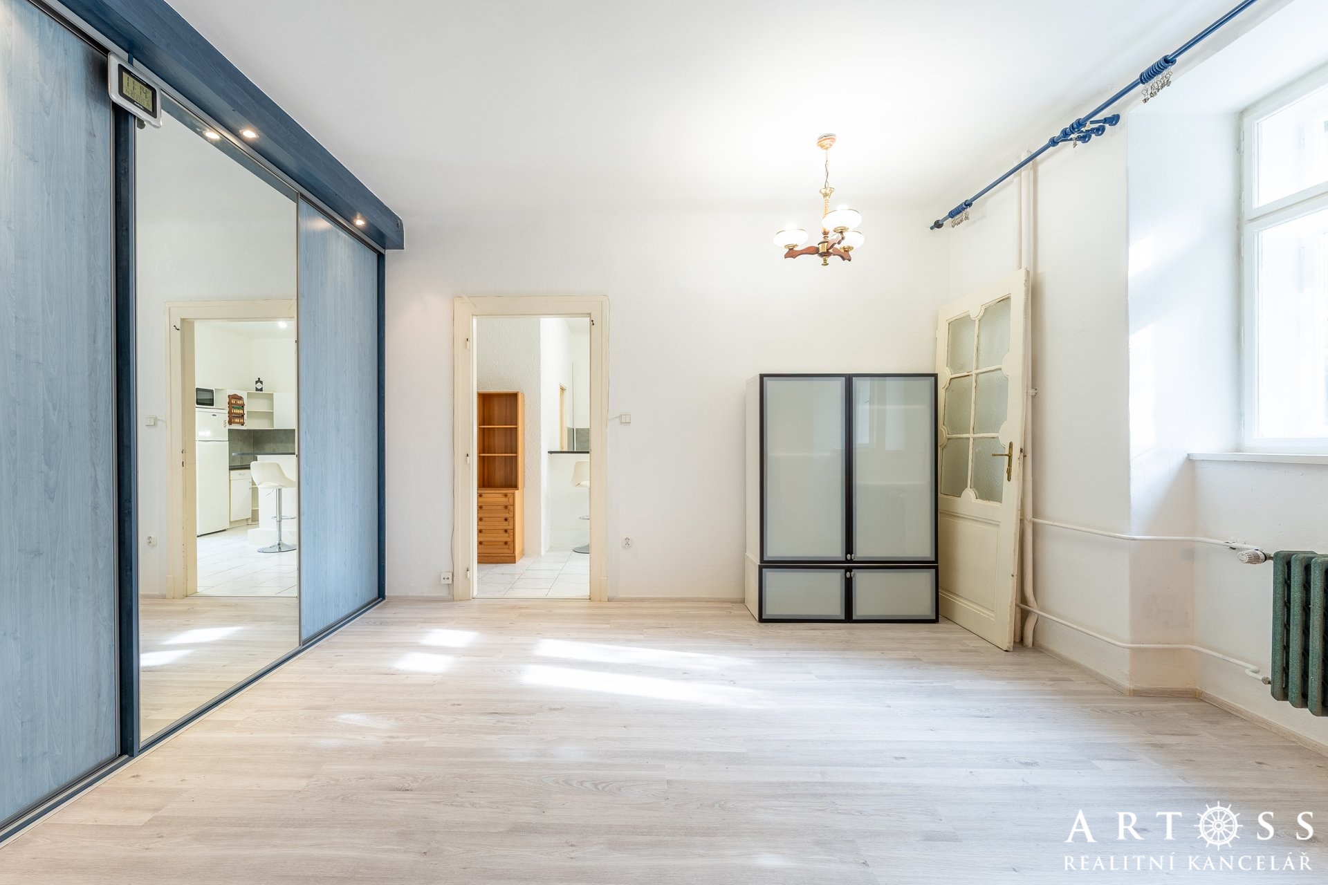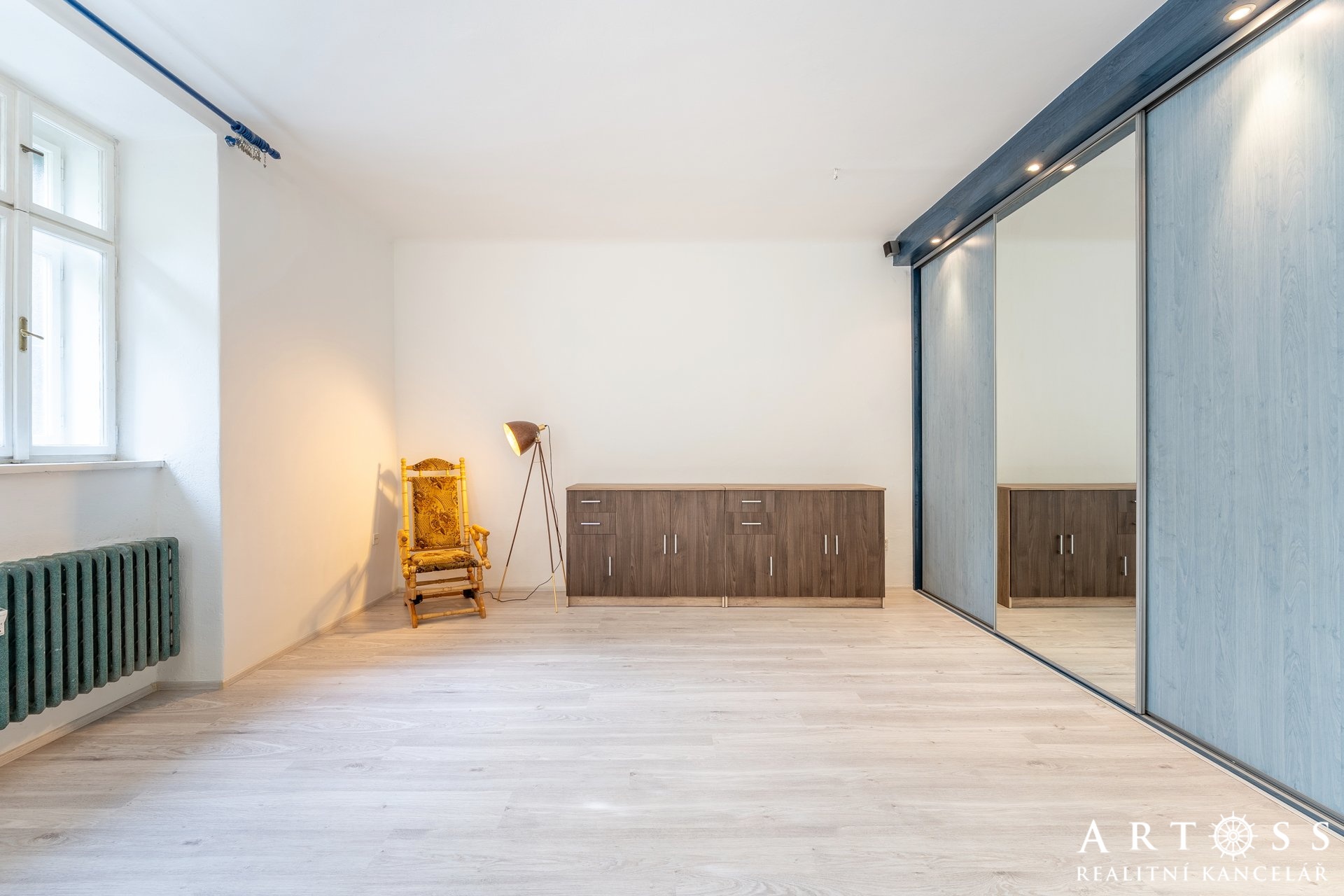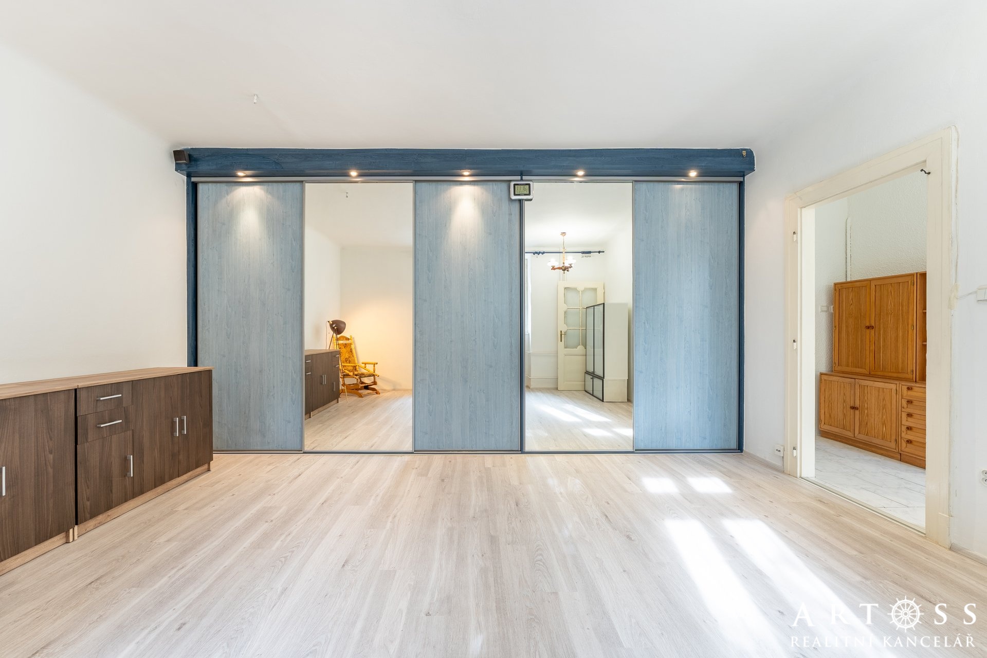 Byt má dva velké pokoje a menší místnost, kterou dnes majitelé využívají jako úložný prostor, ale ideálně poslouží i jako pracovna nebo malý pokoj pro hosty či dítě. Momentálně je vybaven praktickými regály. Obývací pokoj je vybaven vestavnou skříní na míru přes celou délku pokoje. Všechny pokoje mají samostatné vstupy.