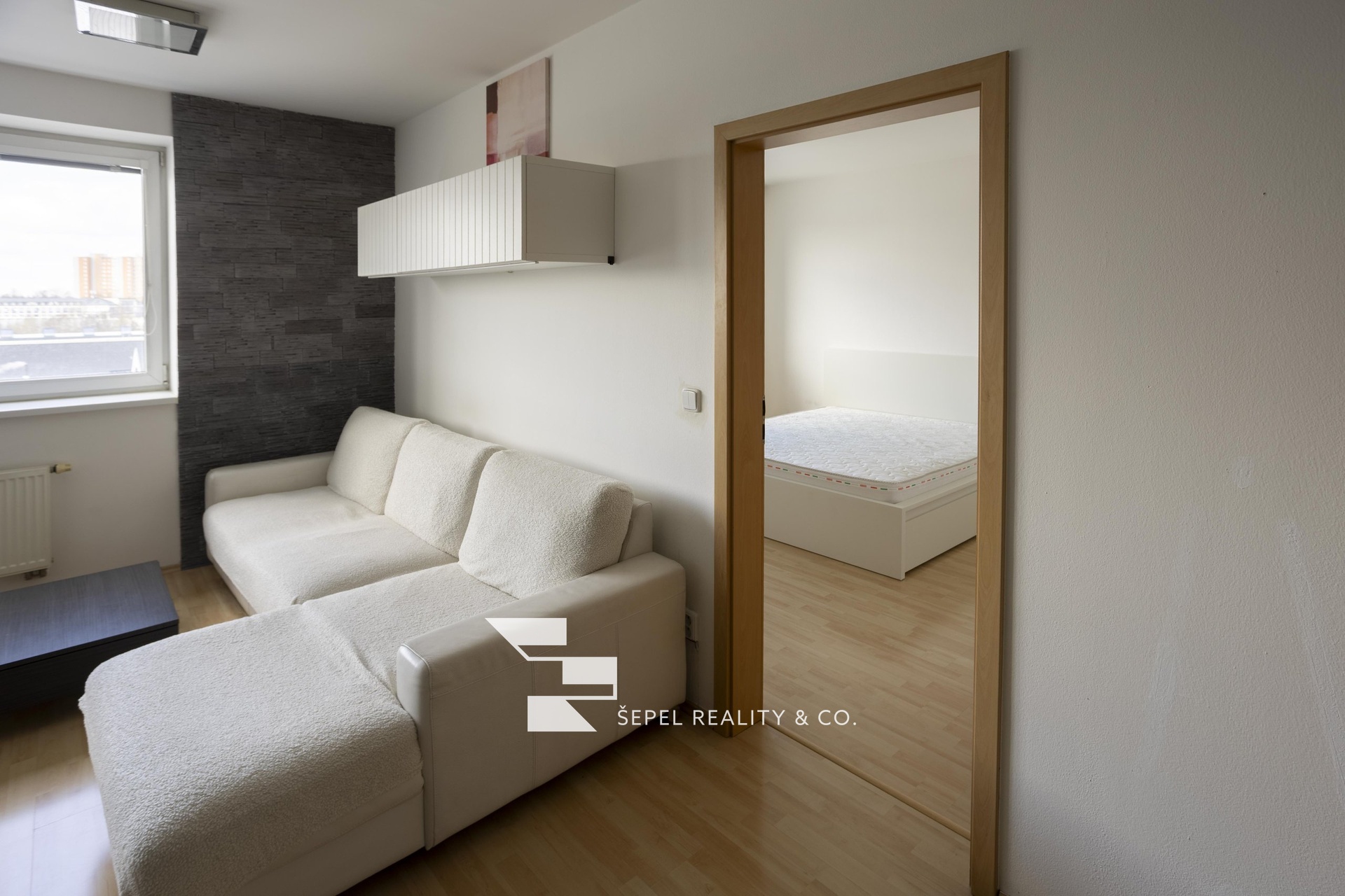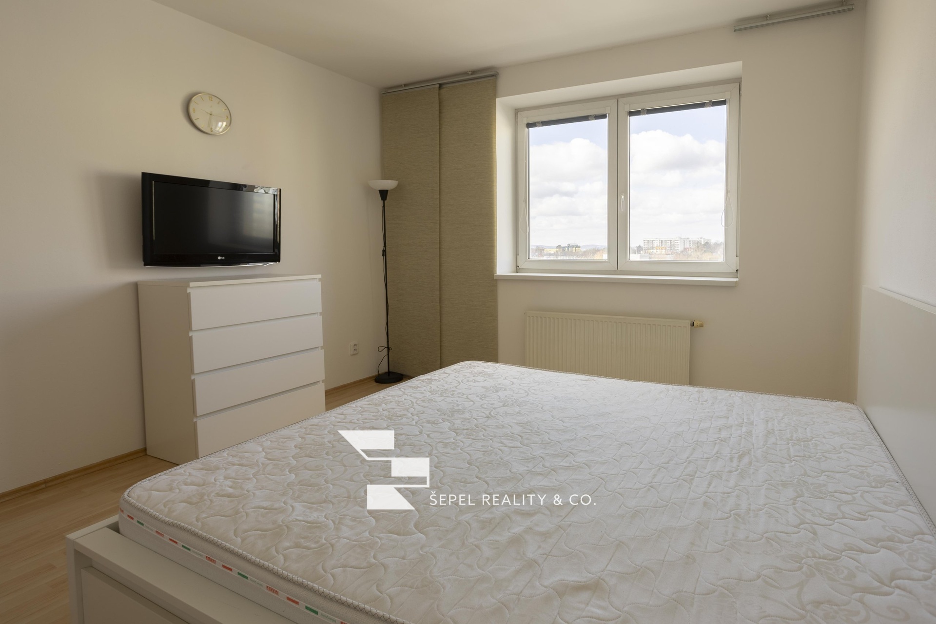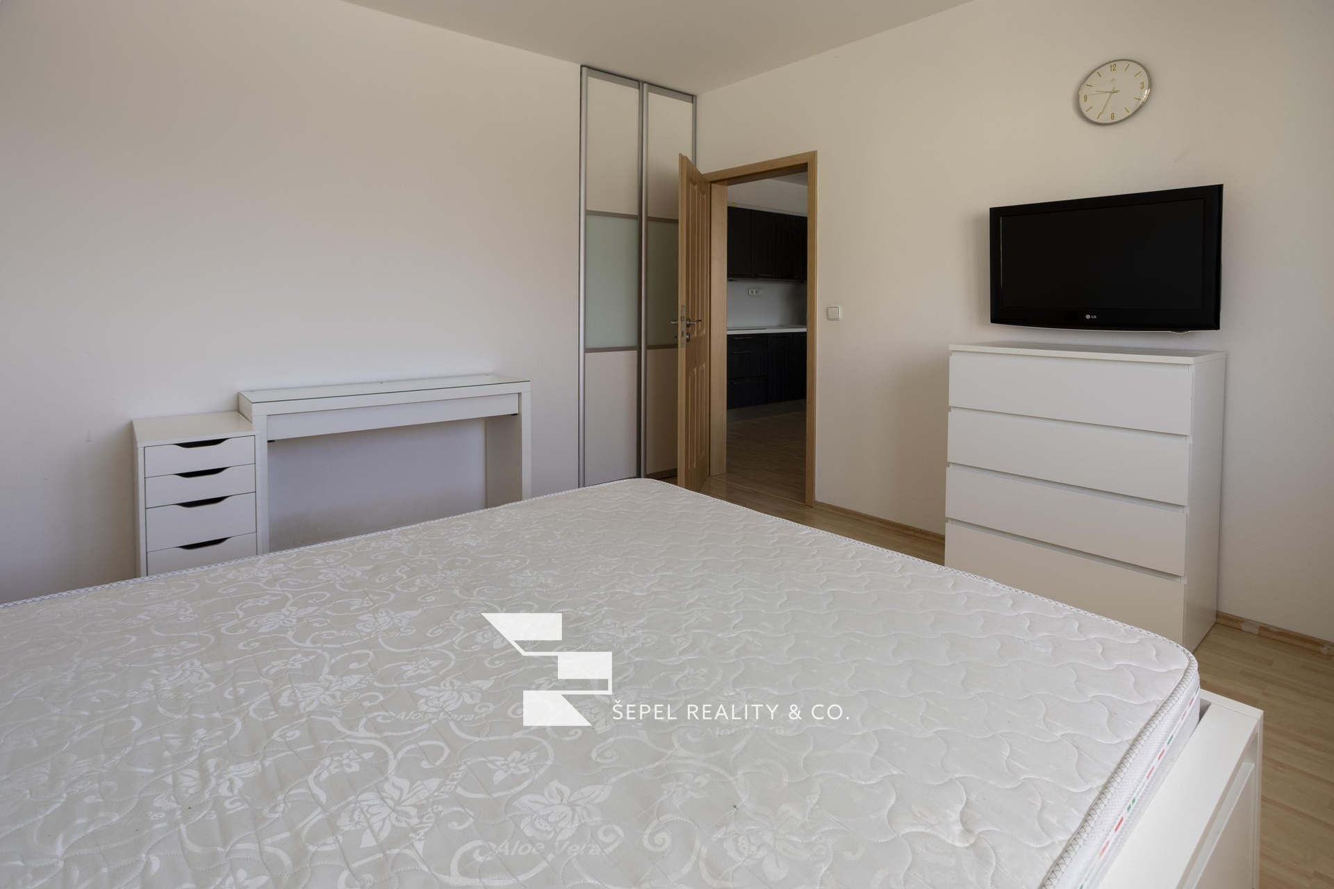 Z obývacího pokoje je vstup do ložnice, kde naleznete pohodlnou dvoulůžkovou postel a komodu pro uložení osobních věcí. I zde je k dispozici televize na nástěnném držáku. Velkou výhodou ložnice je prostorná vestavěná šatní skříň. Vytápění bytové jednotky je řešeno centrálně.