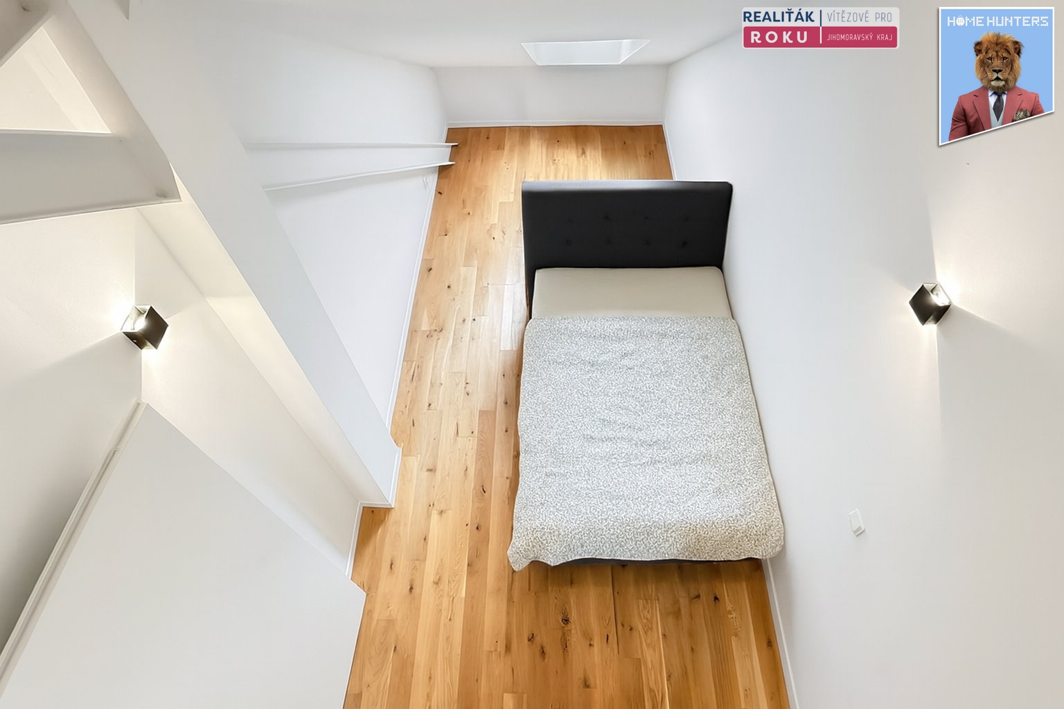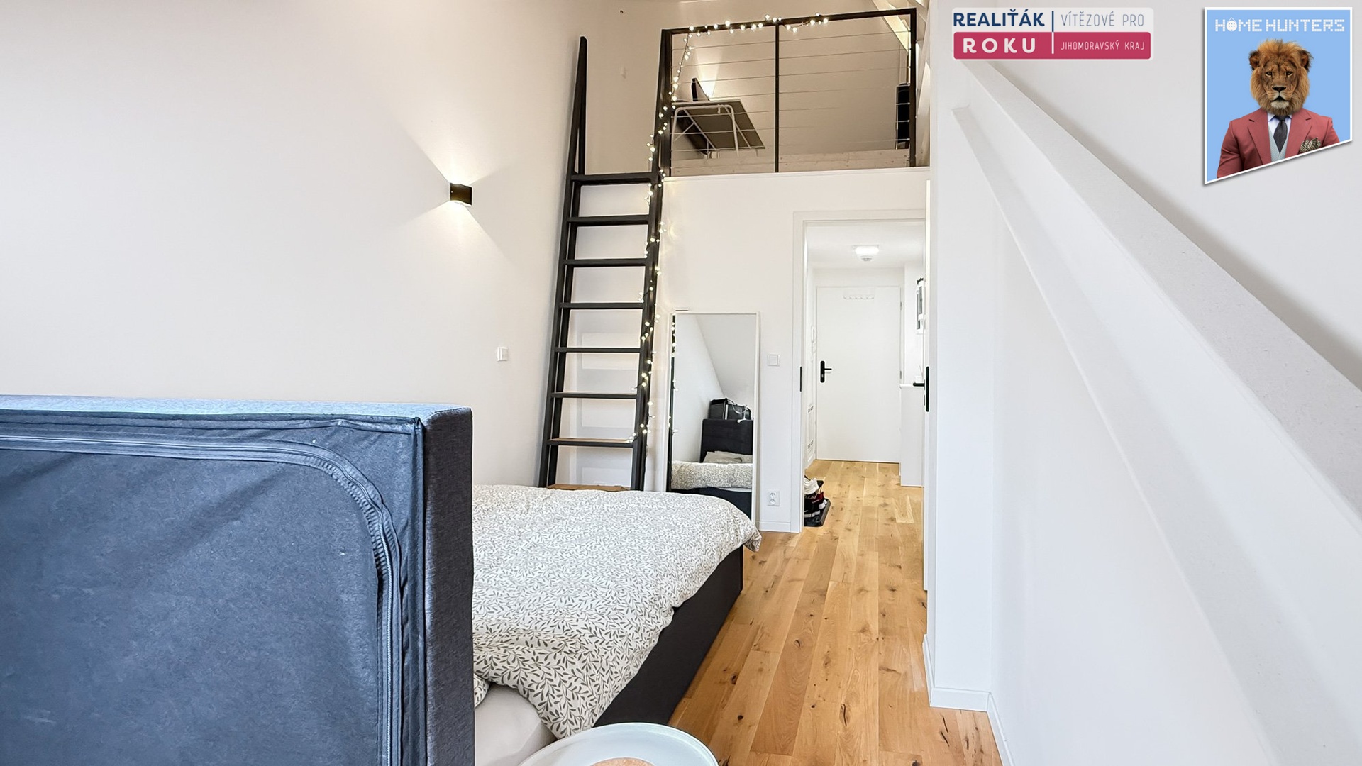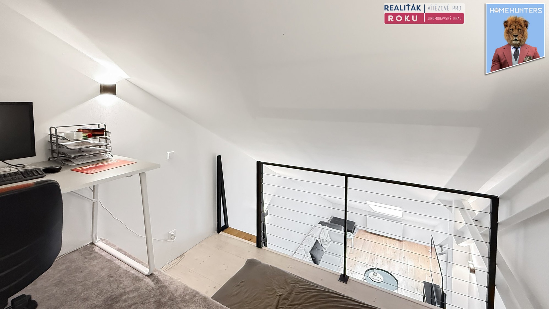 Interiér bytu je světlý, vzdušný a promyšlený do detailu. Velké střešní okno zaplavuje místnost přirozeným světlem, dřevěná podlaha dodává teplo a jednoduché zařízení vytváří pocit klidu a rovnováhy. Z obývací části vede schodiště do menší mezonetové zóny, která slouží jako pracovna nebo místo pro odpočinek – ideální pro ty, kdo pracují z domova. Ložnice je prostorná, útulná a působí velmi příjemně i díky decentnímu osvětlení.