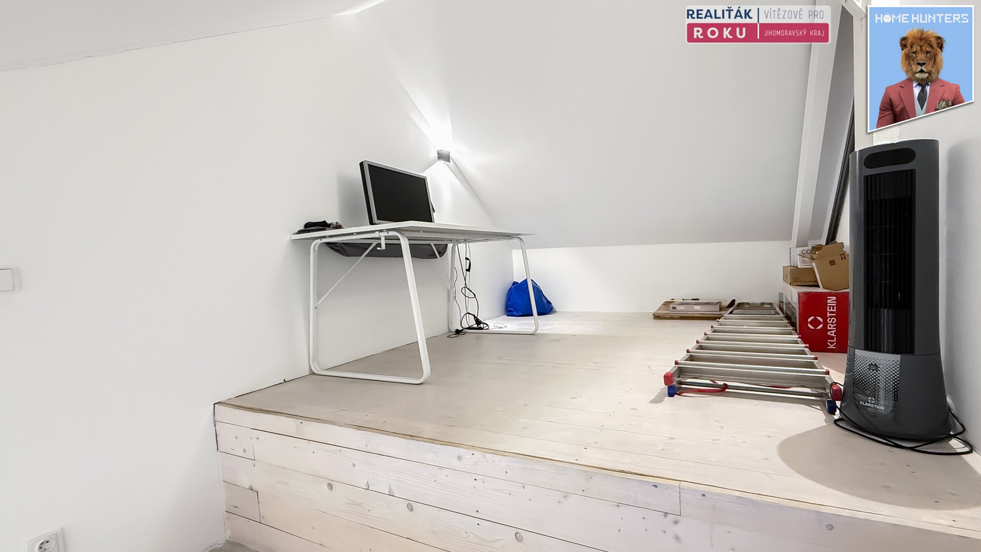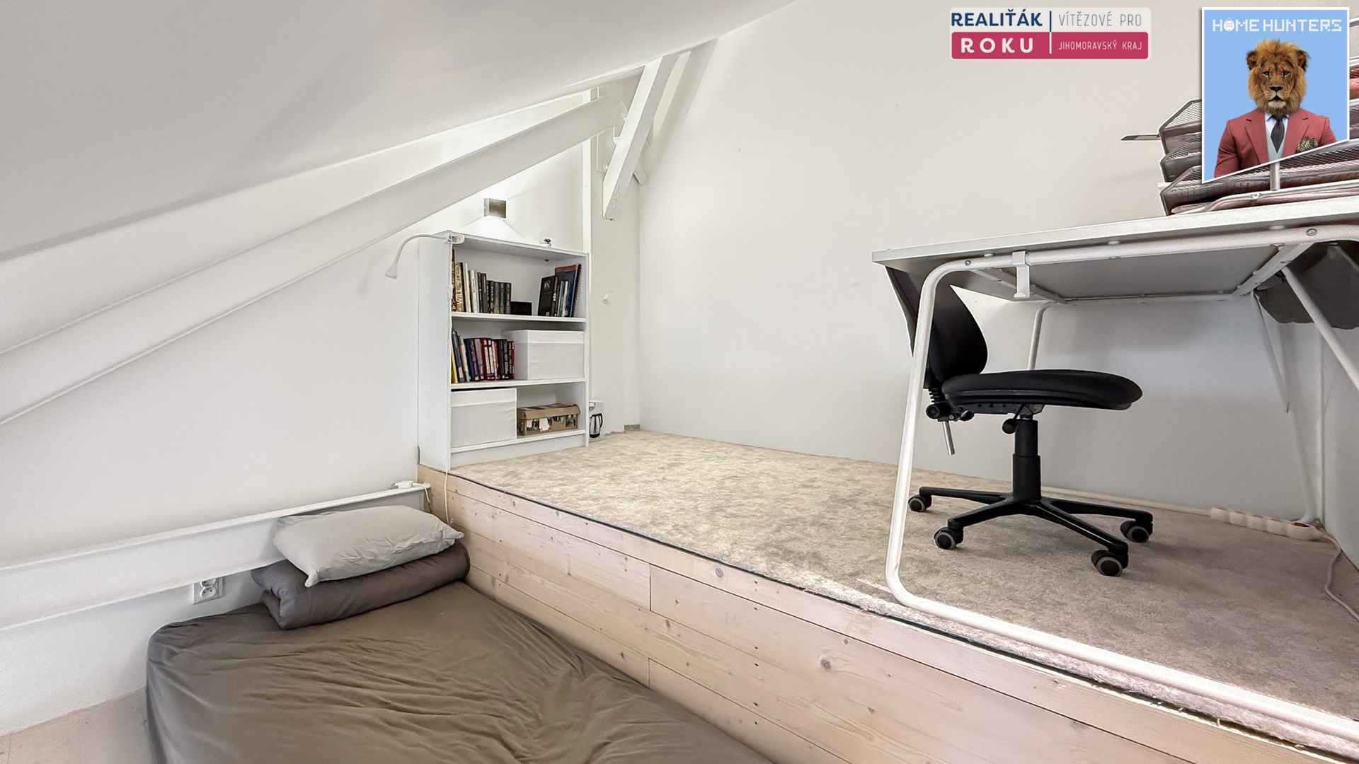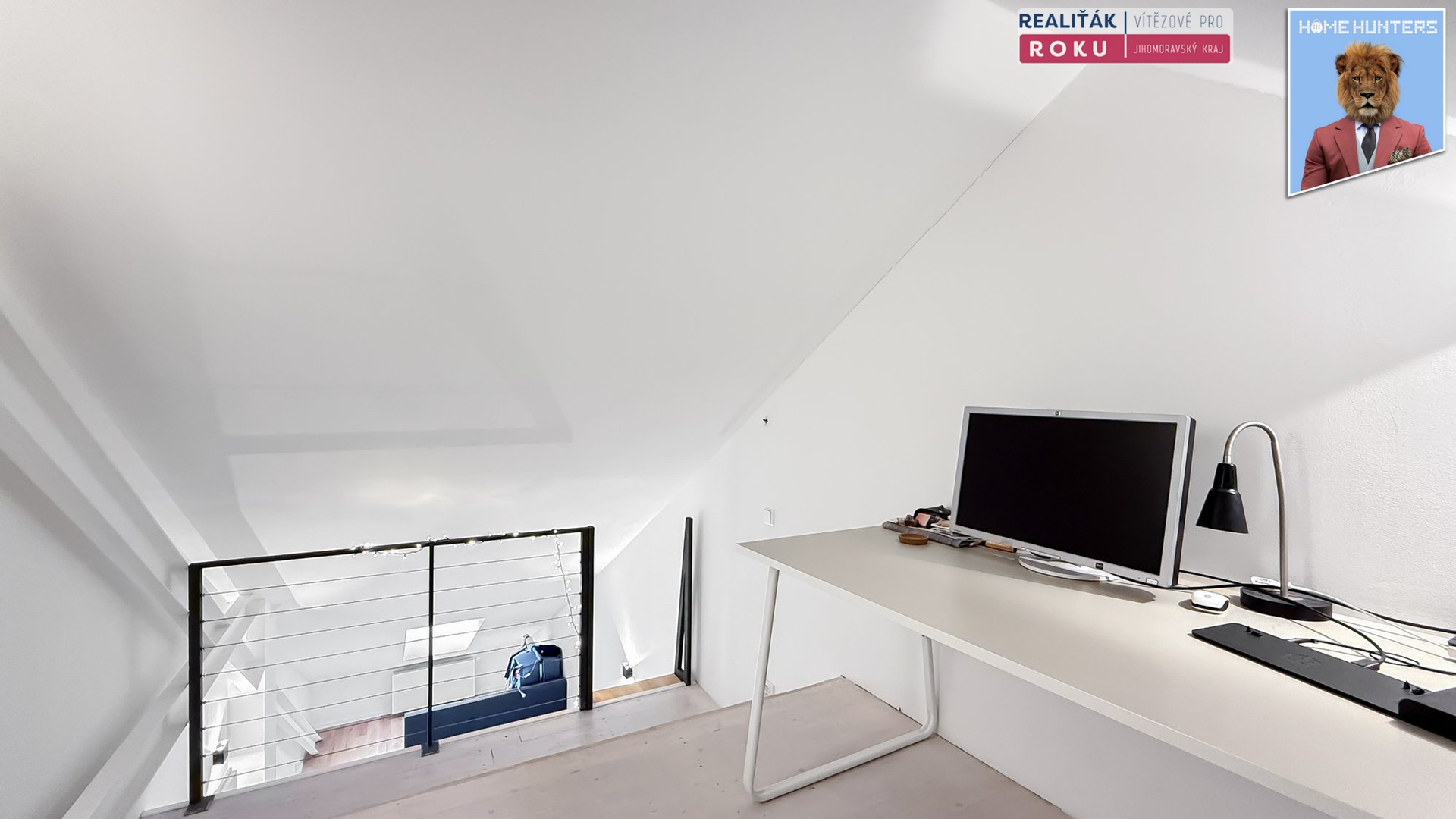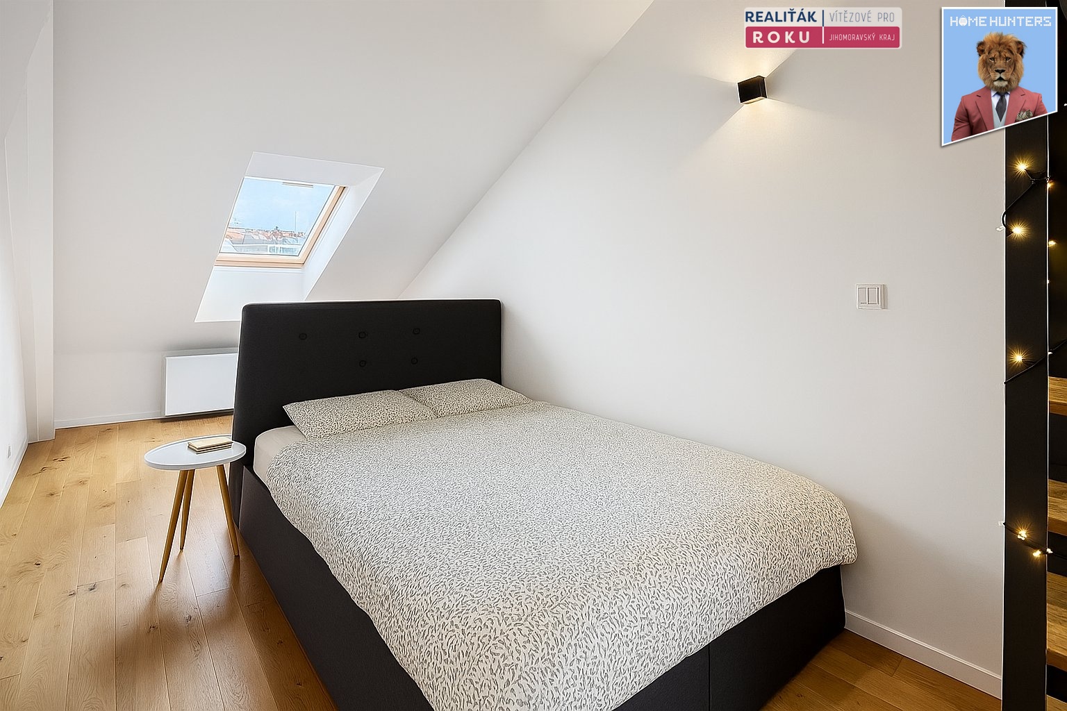 Interiér bytu je světlý, vzdušný a promyšlený do detailu. Velké střešní okno zaplavuje místnost přirozeným světlem, dřevěná podlaha dodává teplo a jednoduché zařízení vytváří pocit klidu a rovnováhy. Z obývací části vede schodiště do menší mezonetové zóny, která slouží jako pracovna nebo místo pro odpočinek – ideální pro ty, kdo pracují z domova. Ložnice je prostorná, útulná a působí velmi příjemně i díky decentnímu osvětlení.