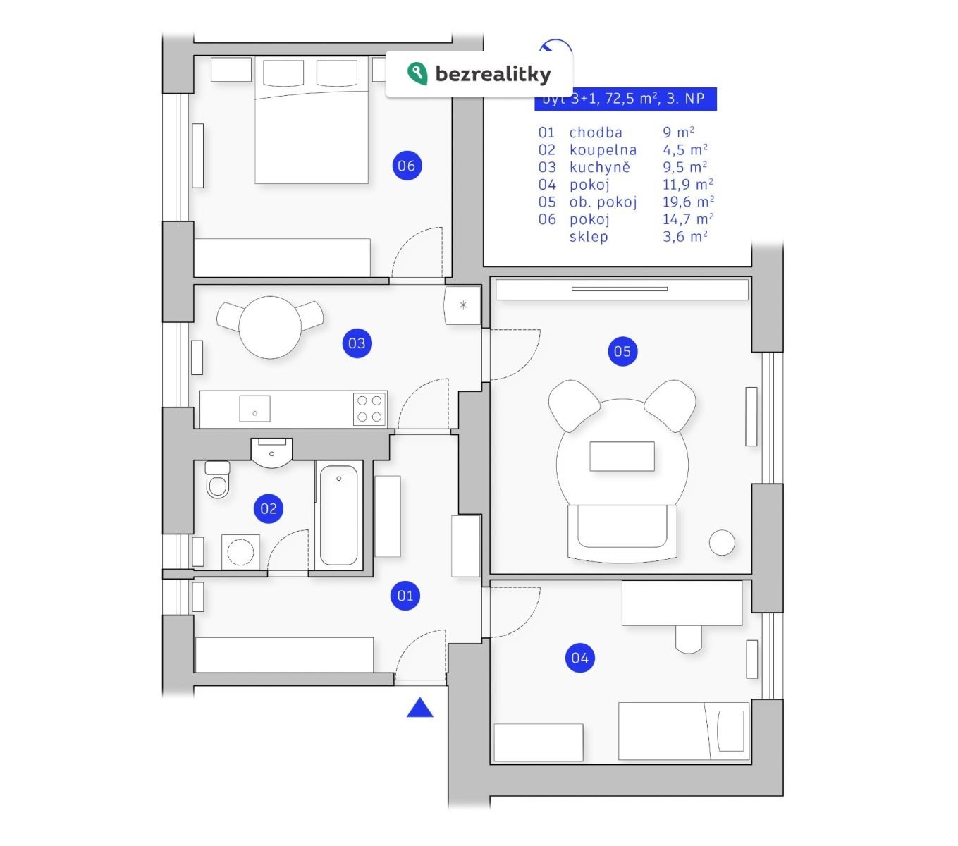 K bytu náleží suchá sklepní kóje pro uskladnění nábytku, nebo například kol. Plocha sklepu (3,6 m2) je dle prohlášení vlastníka počítána do celkové plochy bytu.