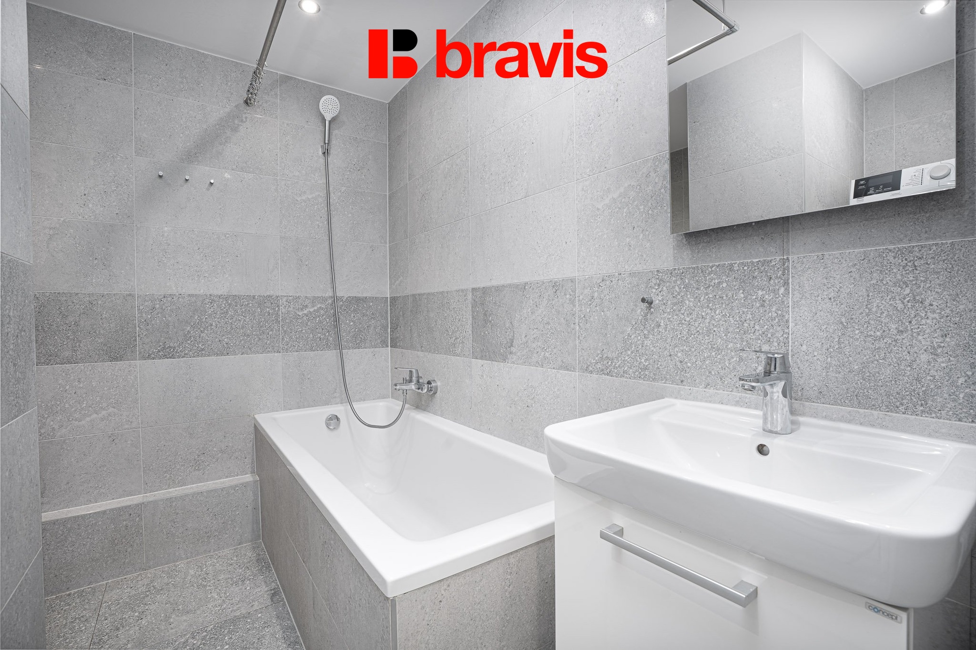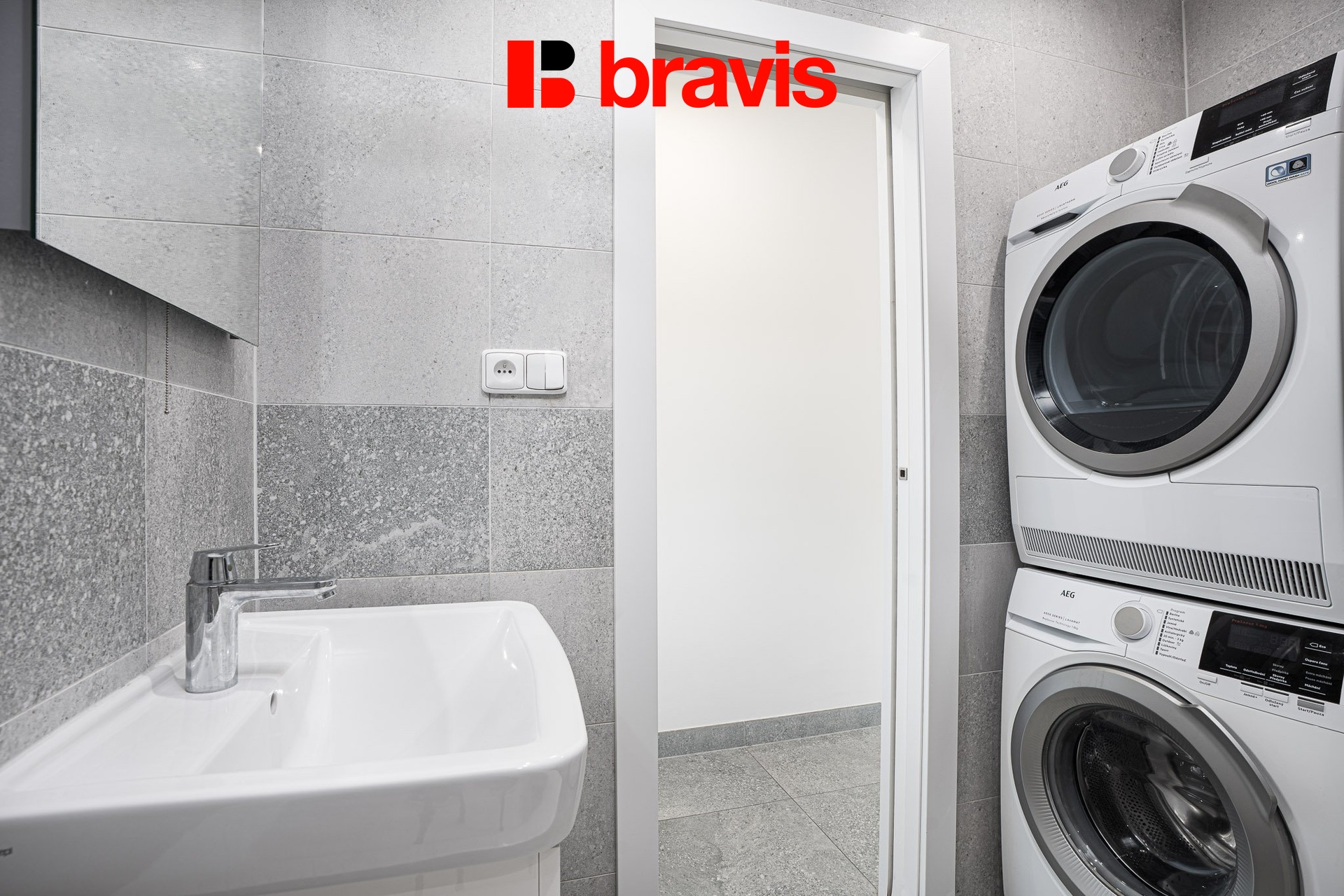 Koupelna disponuje vanou, umyvadlem a toaletou. Součástí je přípojka na pračku a zároveň zde zůstává prostor i pro umístění sušičky. V předsíni se nachází vestavná skříň poskytující dostatek úložného prostoru.