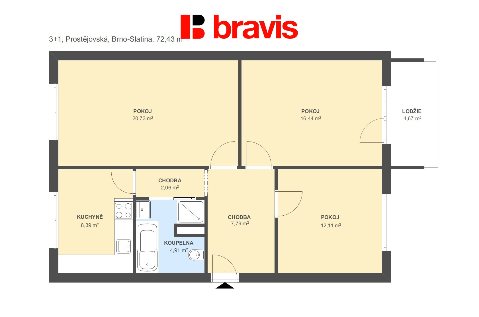 Dispozice bytu je velmi praktická – z centrální chodby jsou přístupné všechny místnosti, tedy kuchyně, koupelna s toaletou a tři samostatné pokoje. Díky tomu jsou pokoje vzájemně neprůchozí, což zajišťuje dostatek soukromí a komfortu pro rodinné bydlení i případné sdílení.