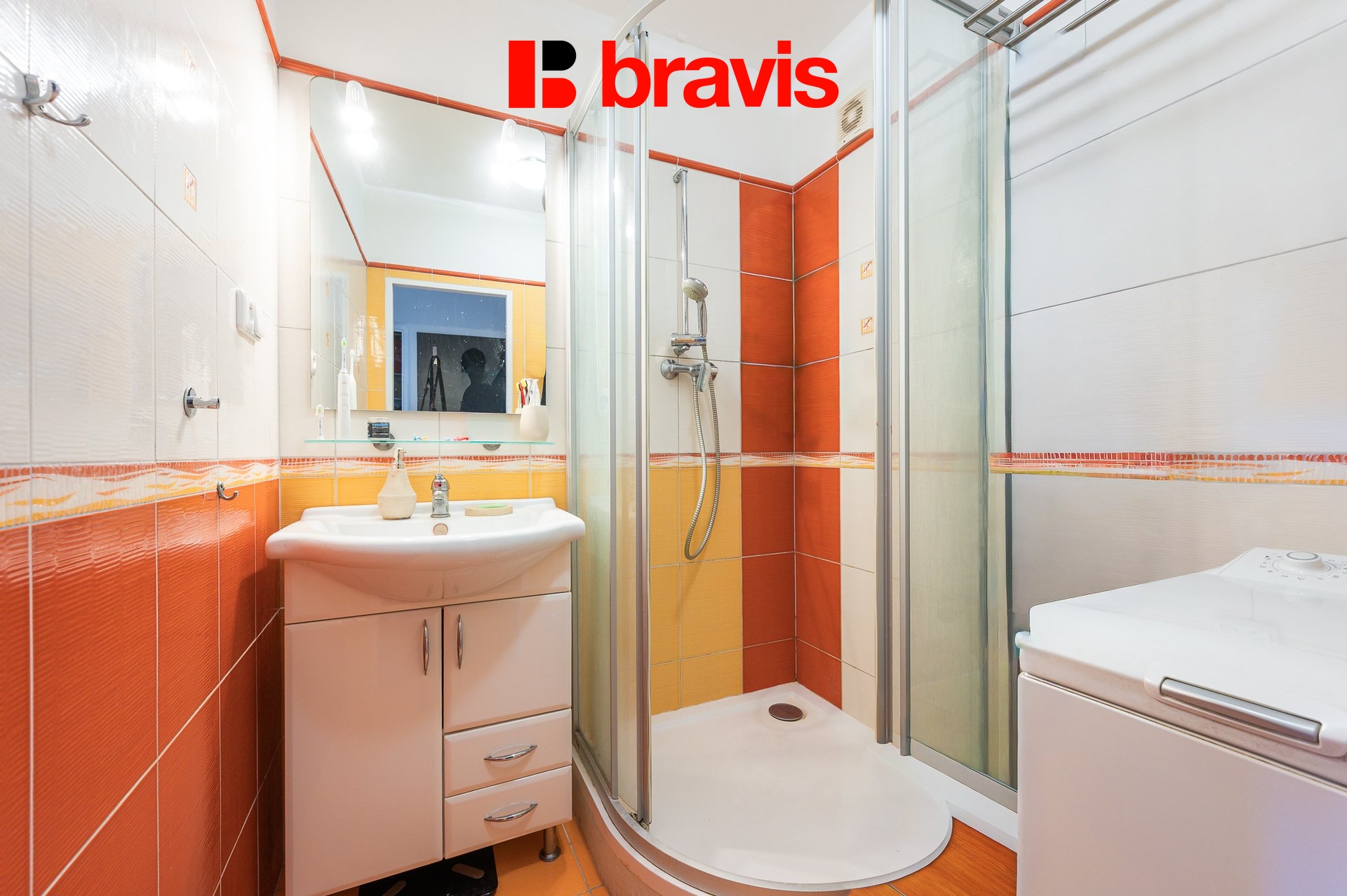 Koupelna se zděným jádrem je vybavena sprchovým koutem, umyvadlem a pračkou.