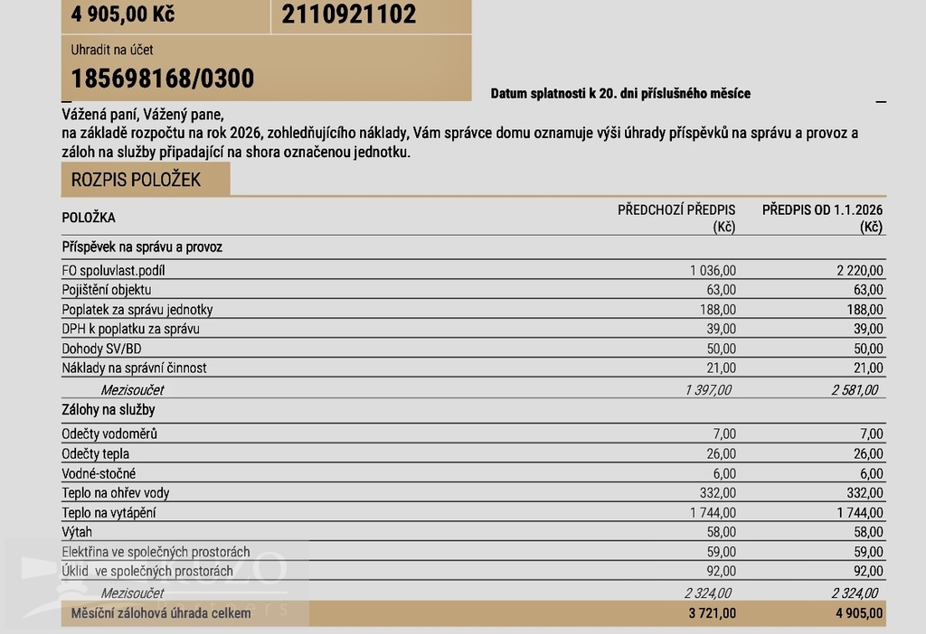 Měsíční předpis plateb činí 4 905,- Kč /1os a zahrnuje: