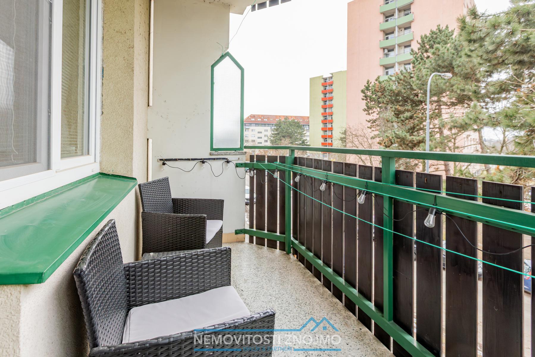 Velkým benefitem je balkon, který díky vzrostlé zeleni poskytuje příjemné soukromí a zároveň dostatek prostoru pro posezení, například pro stůl a dvě židle.