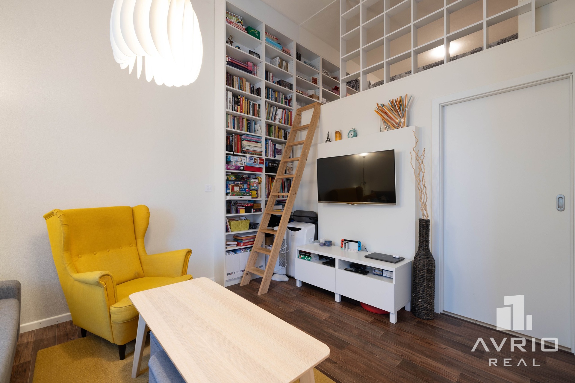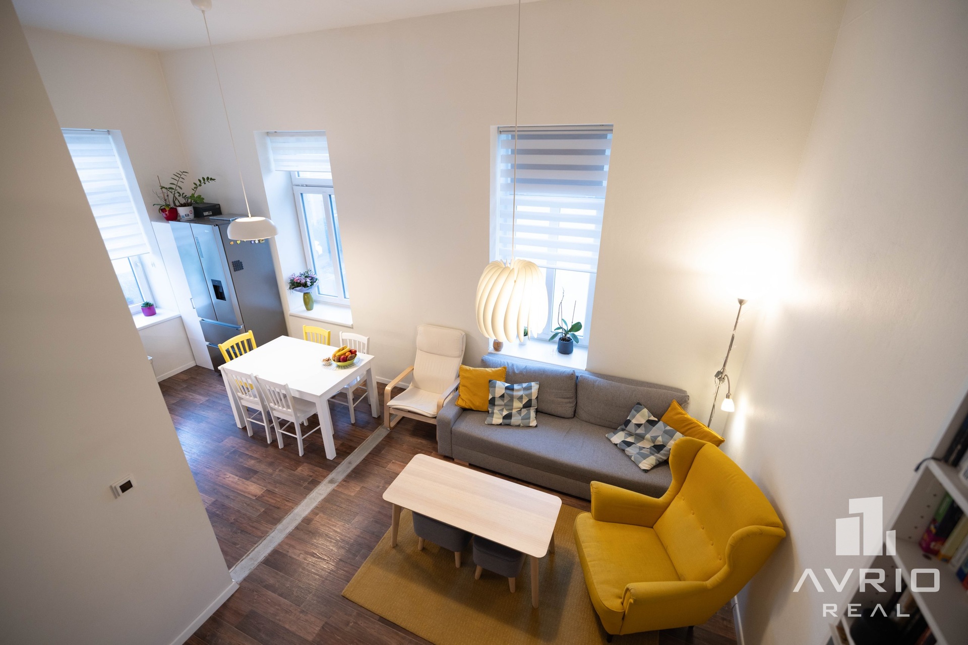 Byt prošel v roce 2021 další změnou, během které došlo k změně původní dispozice na 3+kk. Vysoké stropy v obývací a kuchyňské části dávají příjemný pocit vzdušnosti a světlosti bytu. V dalších obytných místnostech daly vysoké stropy možnost vybudovat spací či odpočinkové galerie, které výrazně rozšiřují užitný prostor bytu. Na vizualizaci pokoje je pak vidět možné umístění manželské postele.