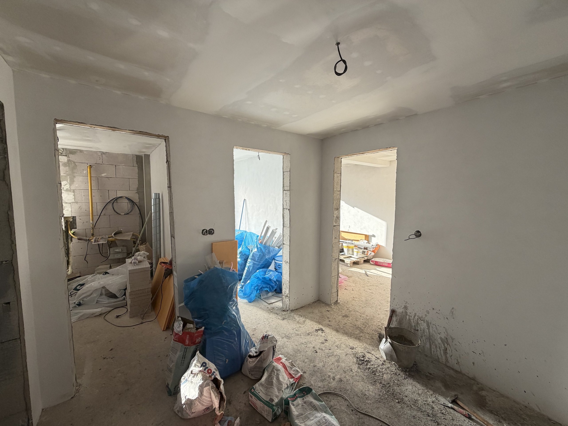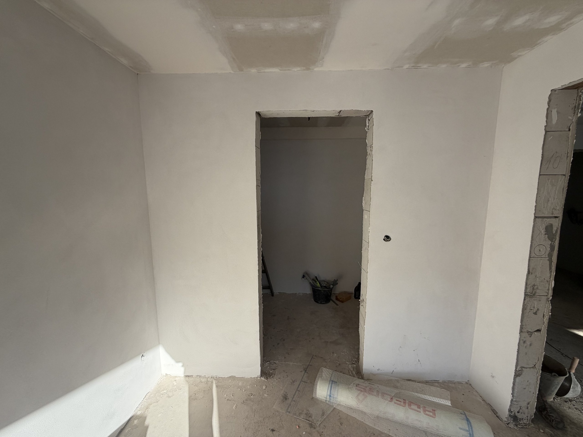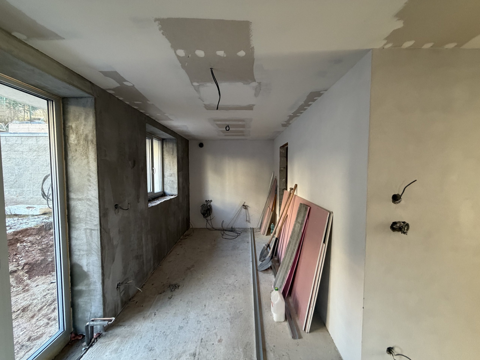 Interiér je aktuálně ve stavu před dokončovacími pracemi, což novému majiteli umožňuje doladit finální povrchy (podlahy, obklady, sanitu, kuchyňskou linku) dle vlastního vkusu. Prostor je připraven na instalaci kuchyně i koupelny, rozvody jsou již vyvedeny.