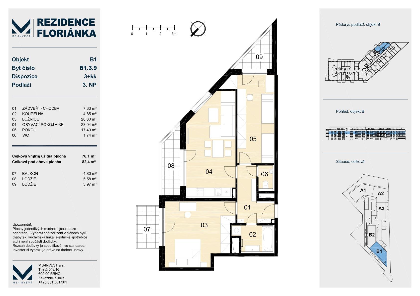 Nabízený byt má dispozici 3+kk, nachází se ve 3. NP.