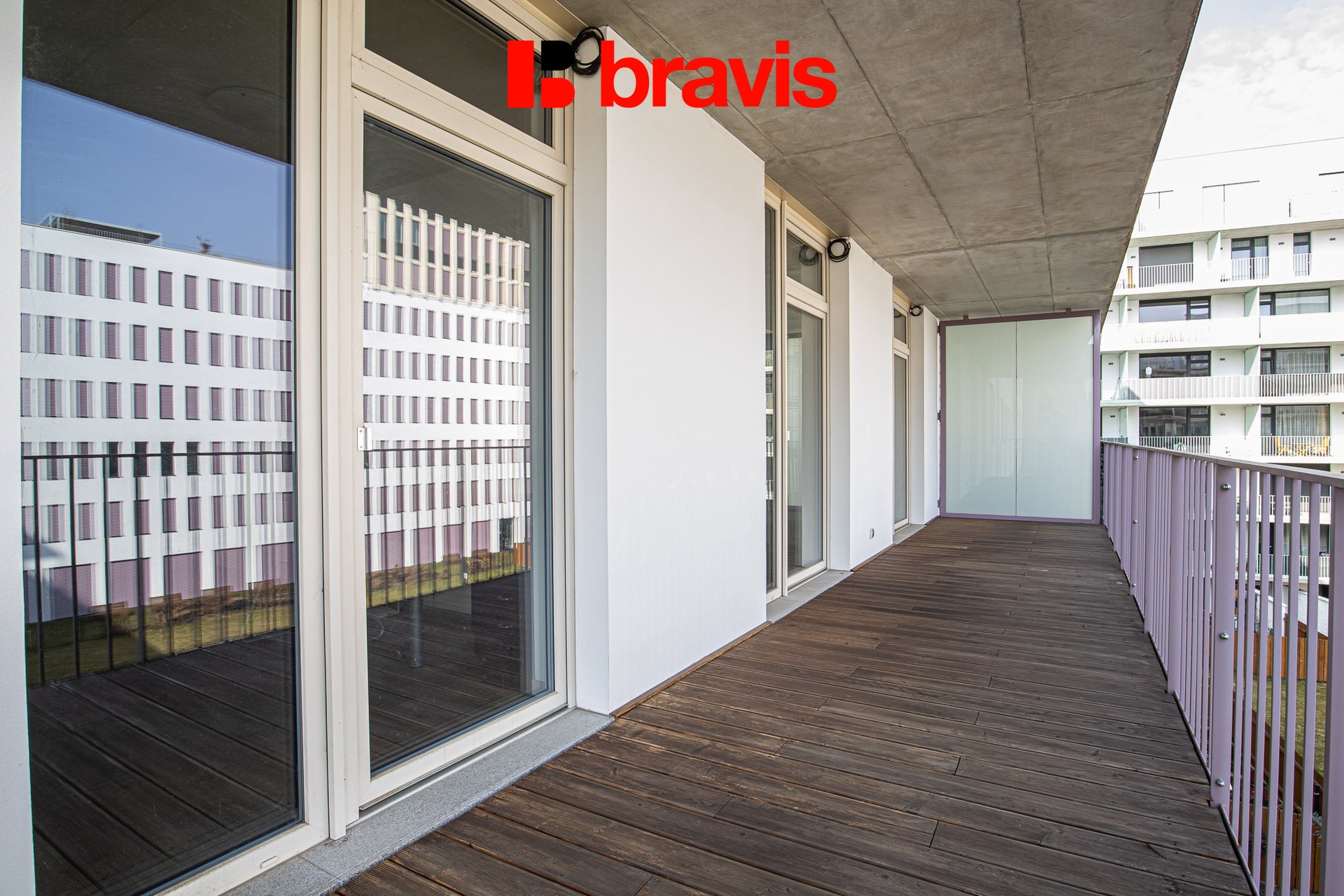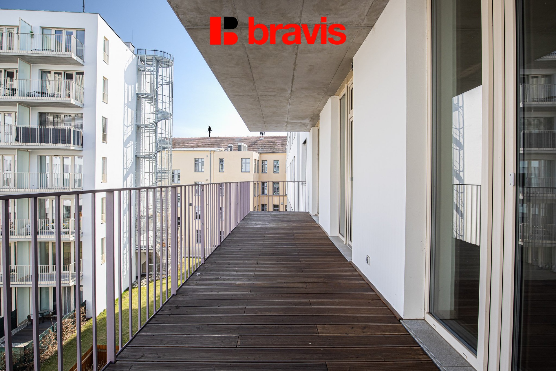 Prostorná terasa po celé délce bytu je orientovaná do klidného vnitrobloku, nabízí dostatek místa pro umístění venkovního nábytku i pěstování bylinek.