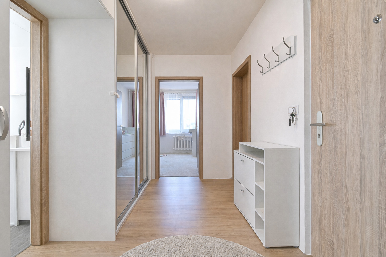 Dominantou je obývací pokoj, který je prostorný a velmi světlý díky velkým oknům a světlé podlahy v dekoru dřeva. Celý prostor působí vzdušně a čistě.