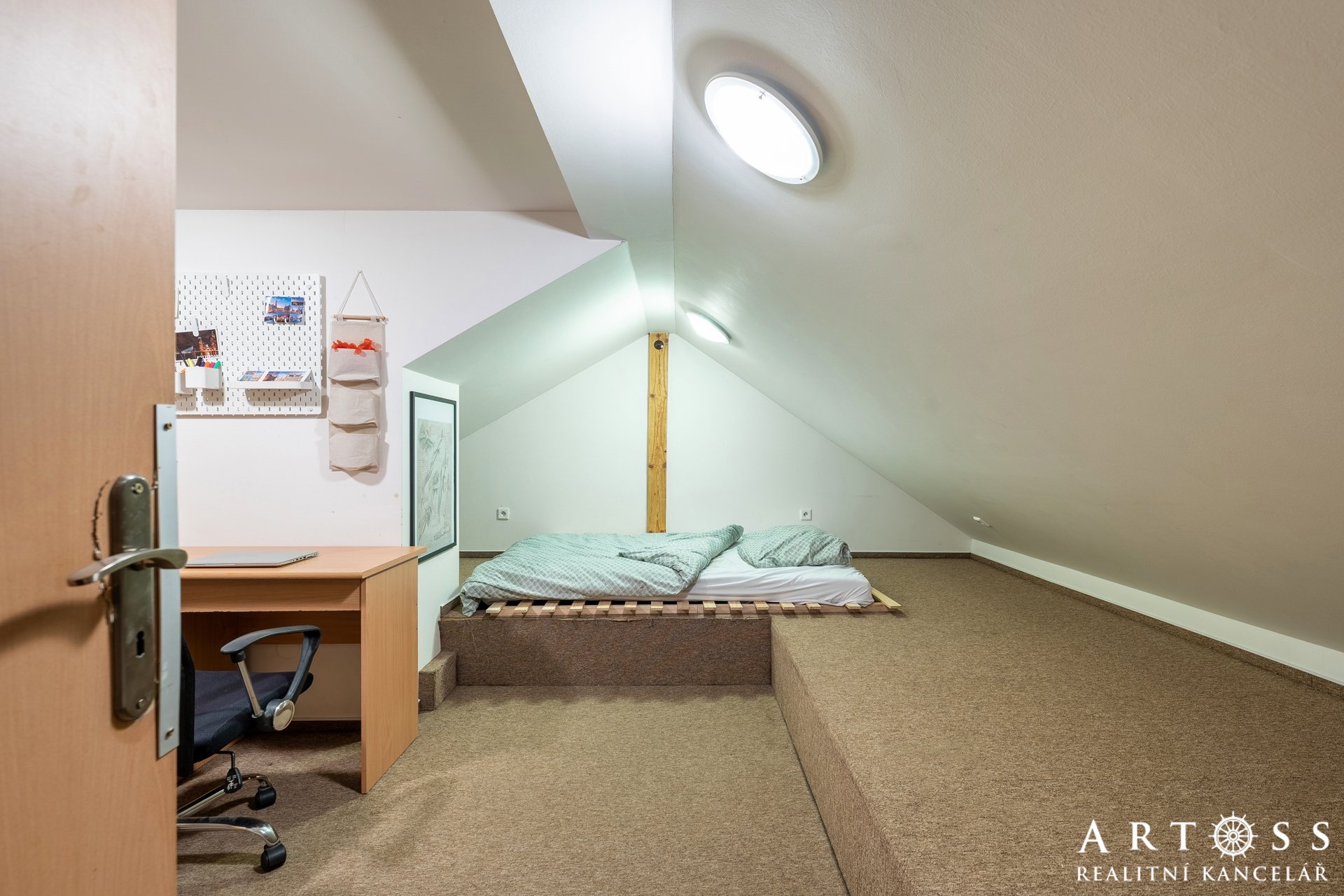 Horní podlaží: horní pokoj (24,5 m2), který může sloužit jako hlavní ložnice, pracovna nebo dětská herna.