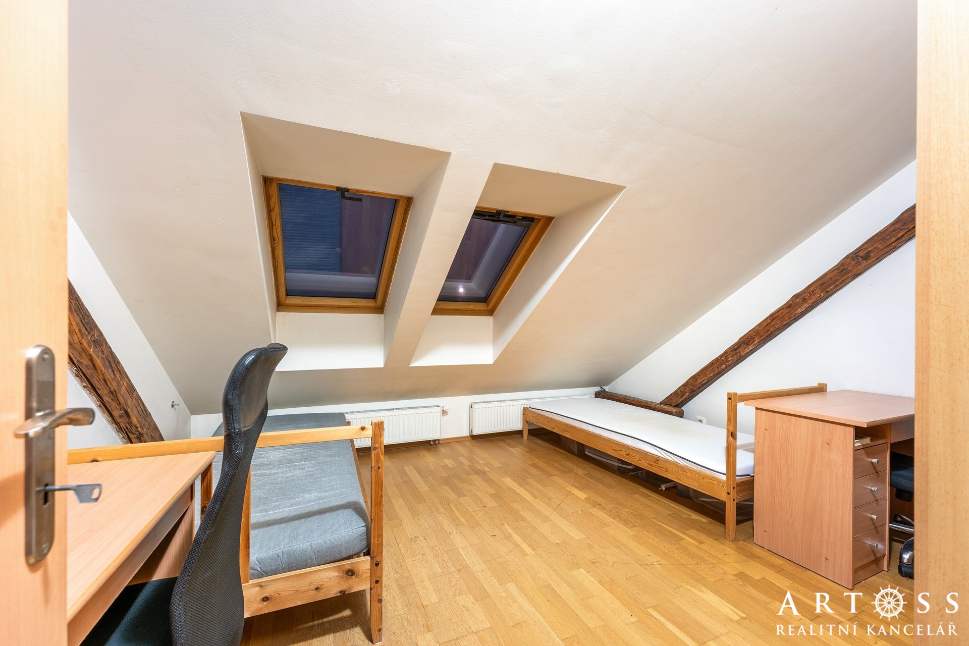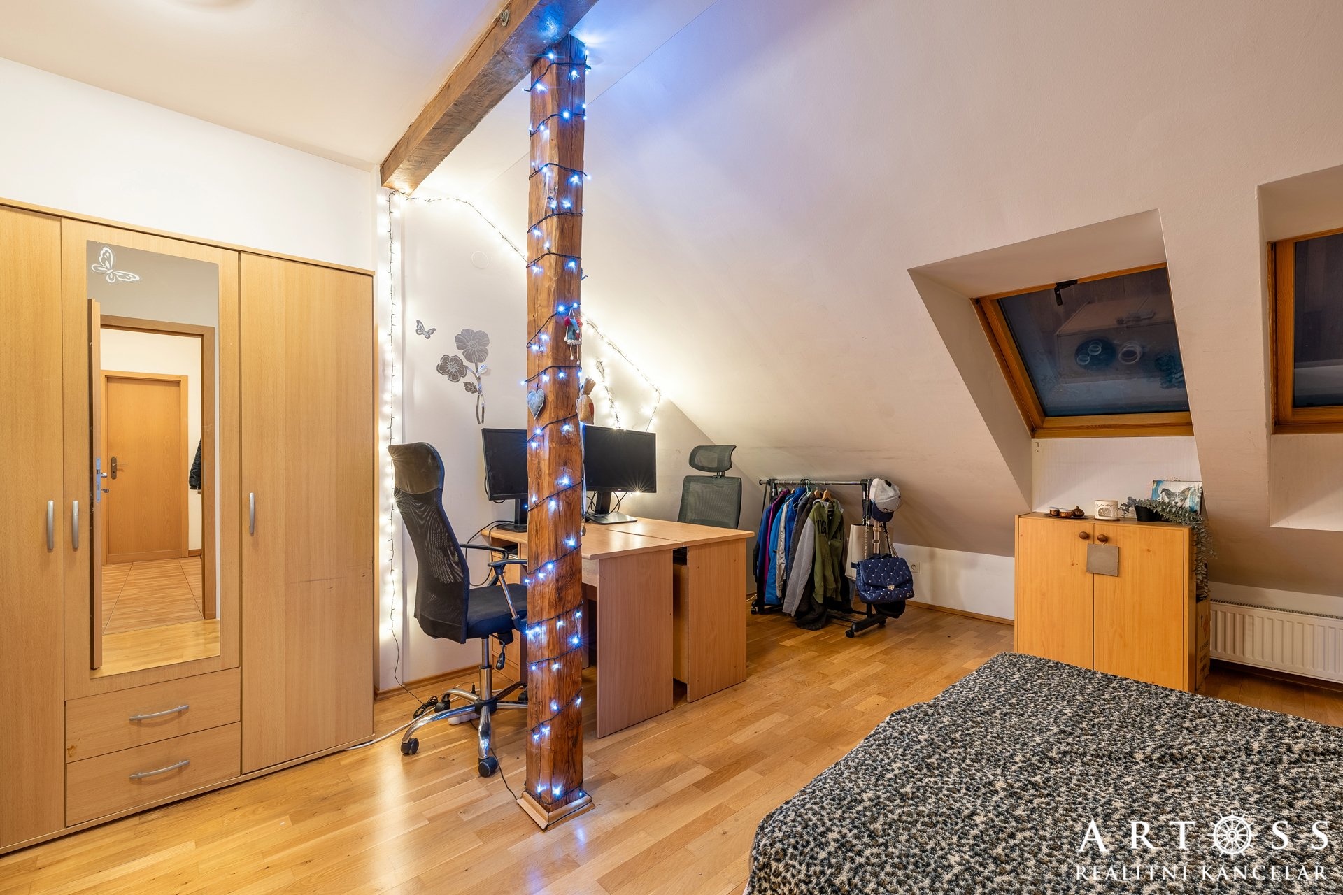 Horní podlaží: horní pokoj (24,5 m2), který může sloužit jako hlavní ložnice, pracovna nebo dětská herna.