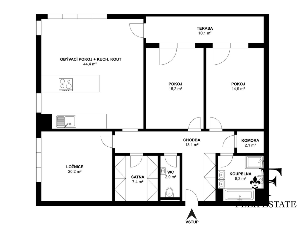 - terasa (9,4 m²) se vstupem z obývacího pokoje a dvou pokojů