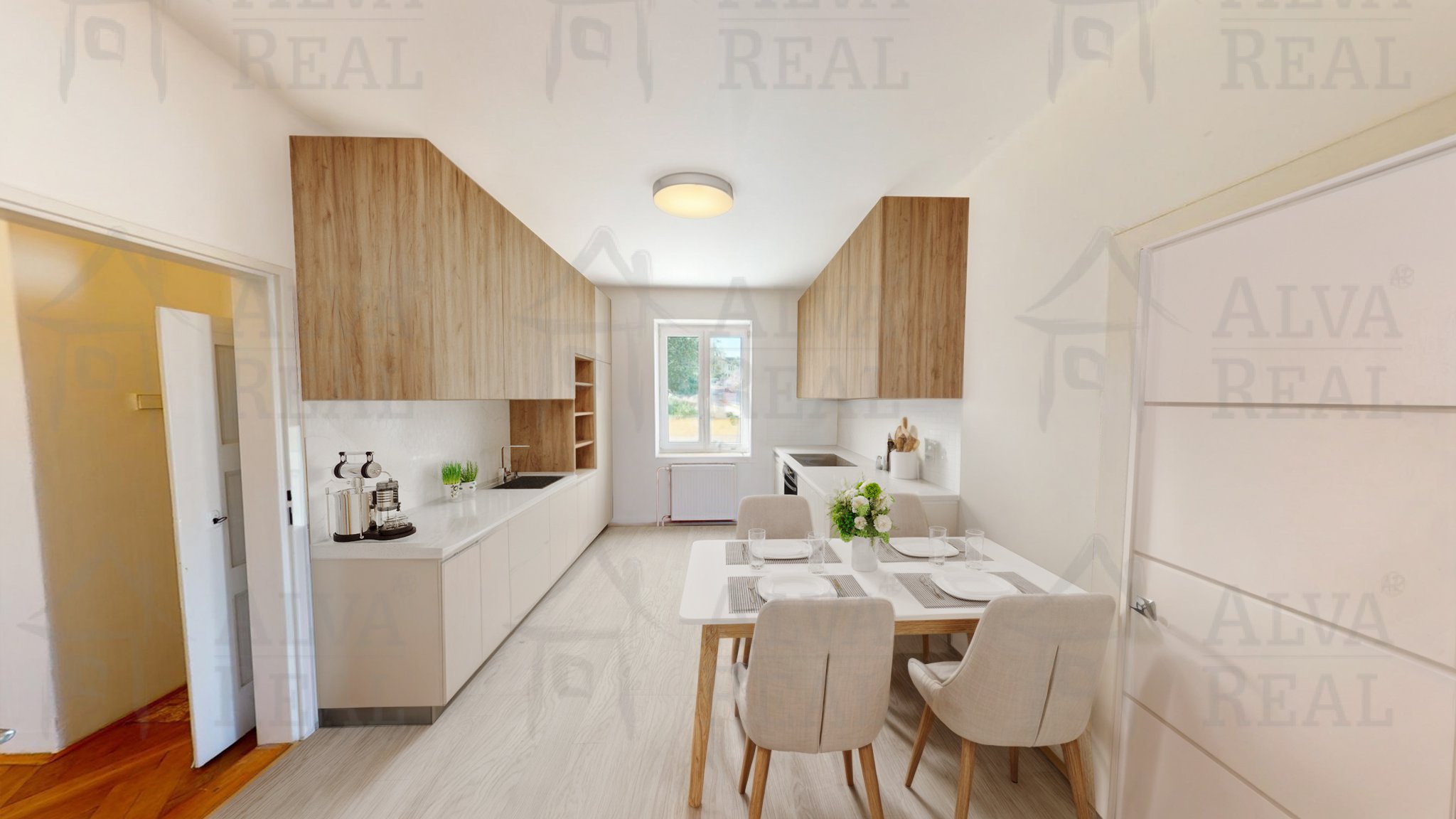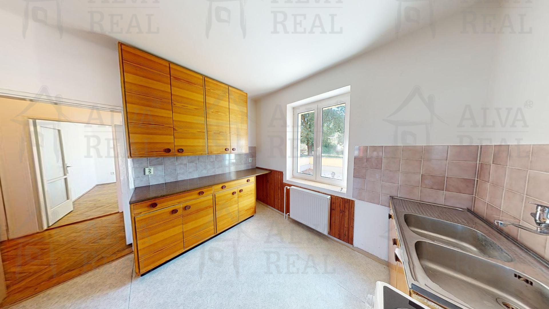 Byt je vyklizen, zůstává pouze vybavení dle fotografií - kuchyňská linka, vybavení koupelny, policový regál ve spíži.