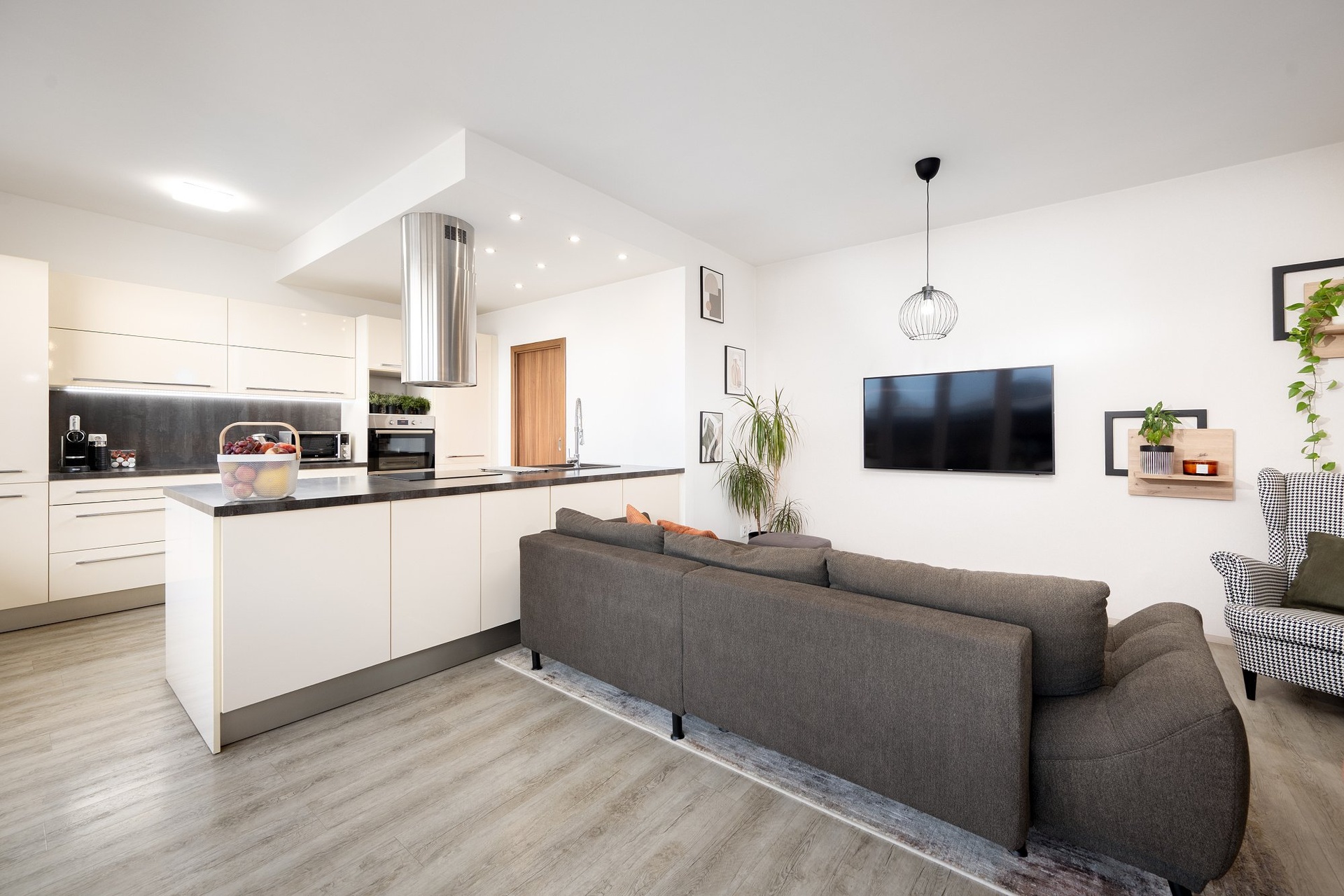 Obývací část bytu vás ohromí svojí atmosférou a světlem. Napříč celým pokojem se táhne velkoformátové okno s výstupem na terasu a panoramatickým výhledem přímo na kostel ve Starém Lískovci a do zeleně okolo. Celý prostor je logicky rozdělen na pracovní, jídelní a odpočinkovou část.