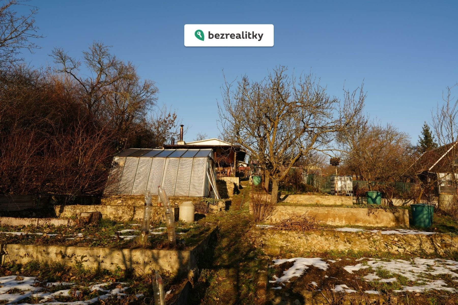 Zahrada: Skleník, ovocné stromy, keře a připravené záhony. Dešťová voda je svedena do nádrží.