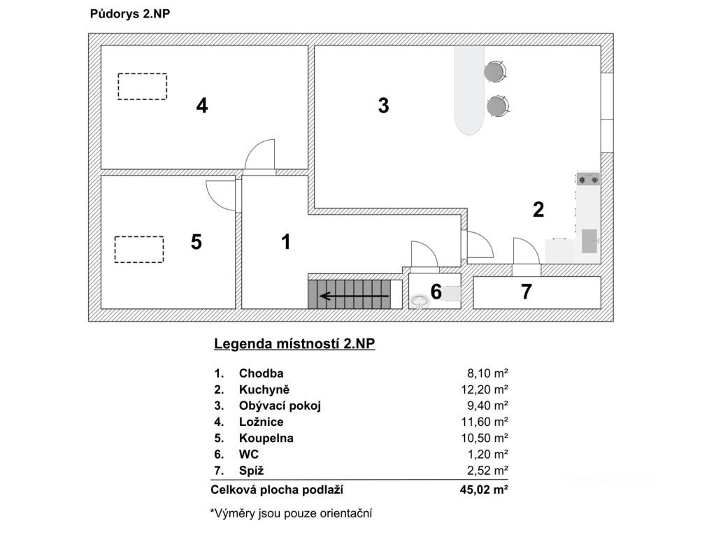 • 2. patro: byt 2+kk o celkové ploše 45,02 m².