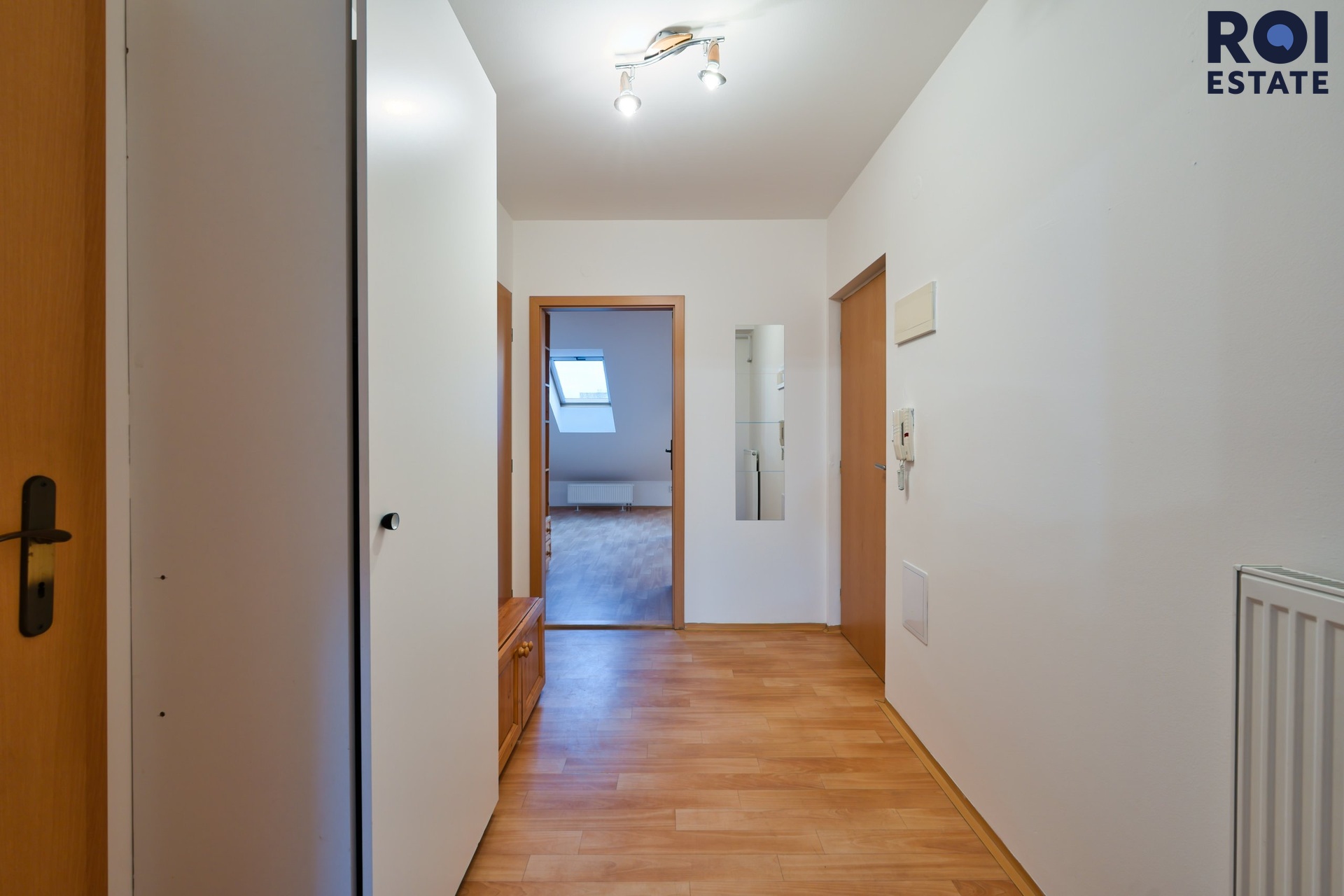 Byt se nachází ve čtvrtém – podkrovním patře udržovaného domu bez výtahu. Dominantou je okno a terasa s výhledem přímo na Špilberk a Petrov, které vám každý den připomene, že bydlíte opravdu v Brně.