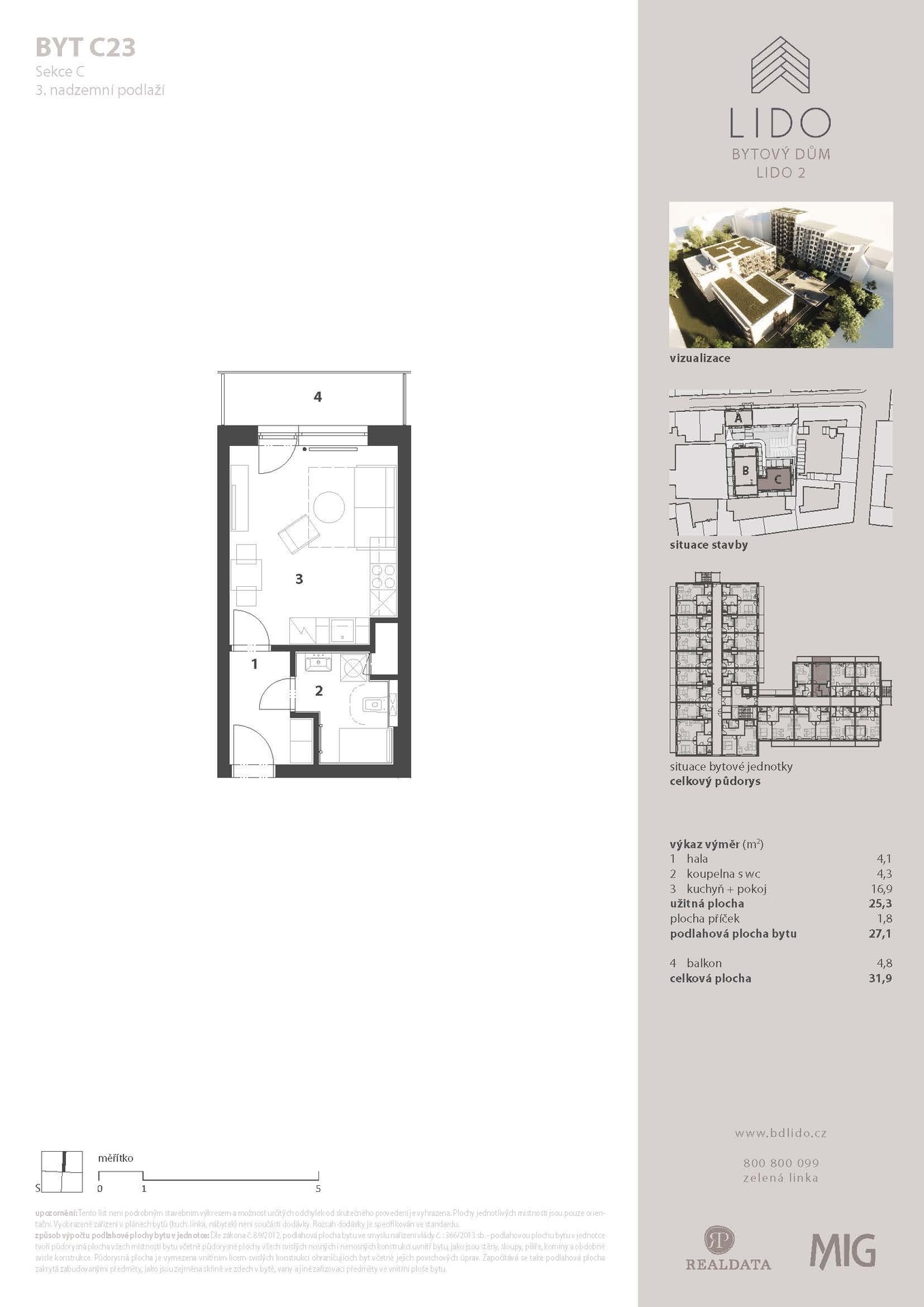 hala (4,1 m²), obývací pokoj s kuchyňským koutem (16,9 m²), koupelna s WC (4,3 m²), balkon (4,8 m²)