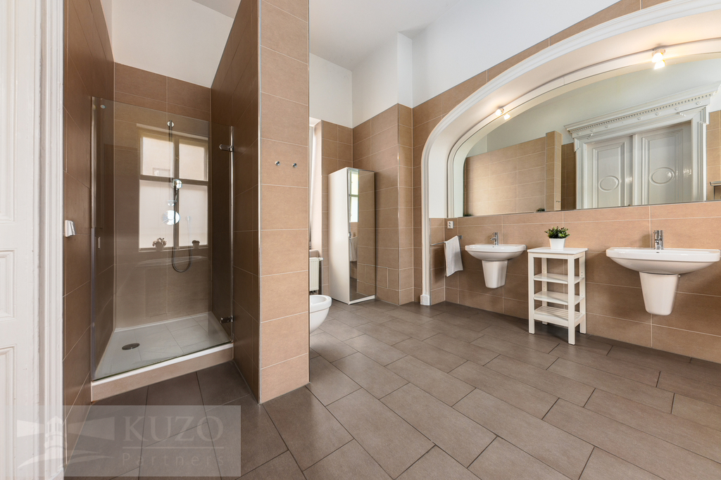 designová prosvětlená koupelna se dvěma okny (18,2 m²) s rohovou vanou, sprchovým koutem, dvěma umyvadly, WC a bidetem,