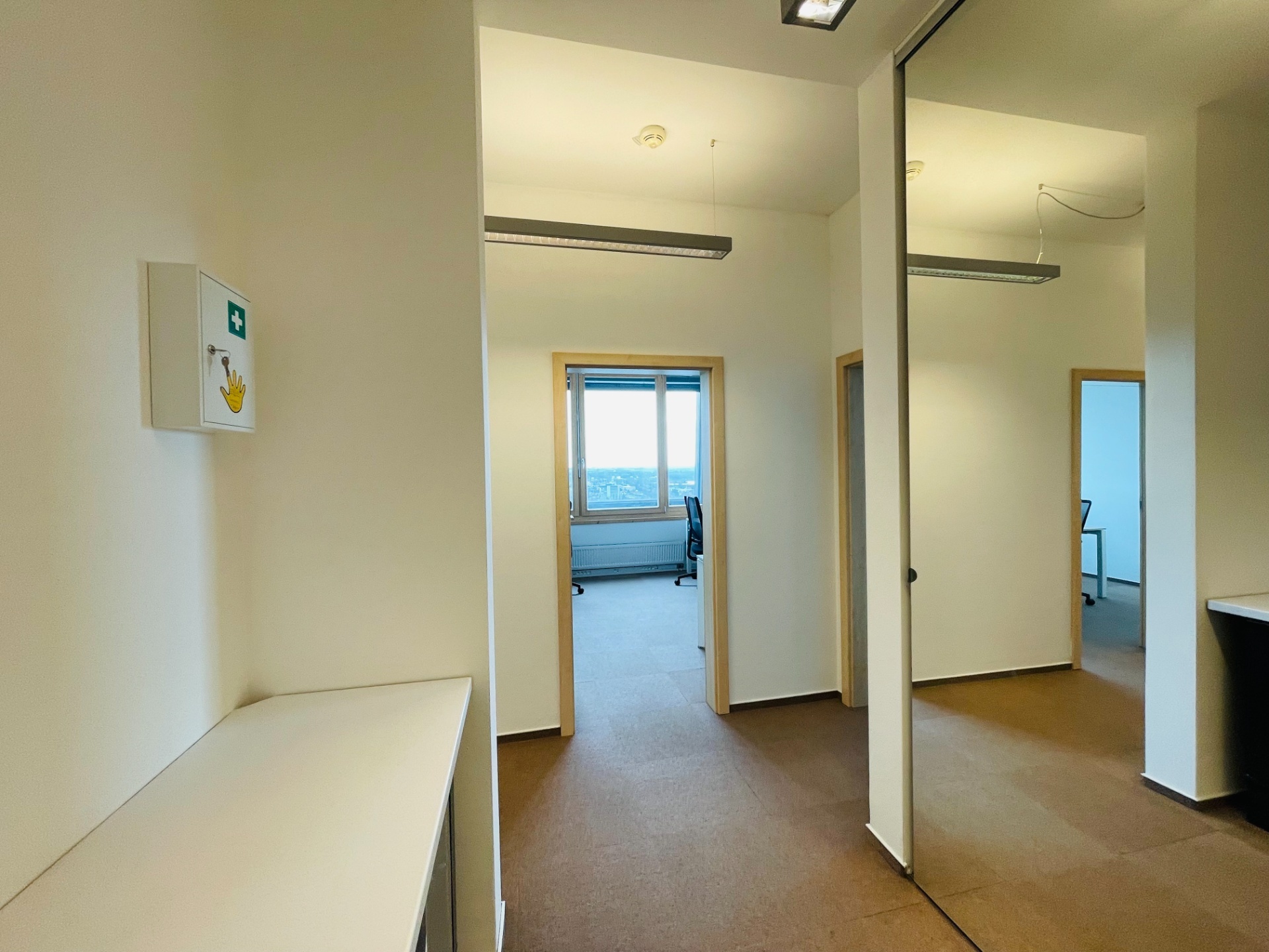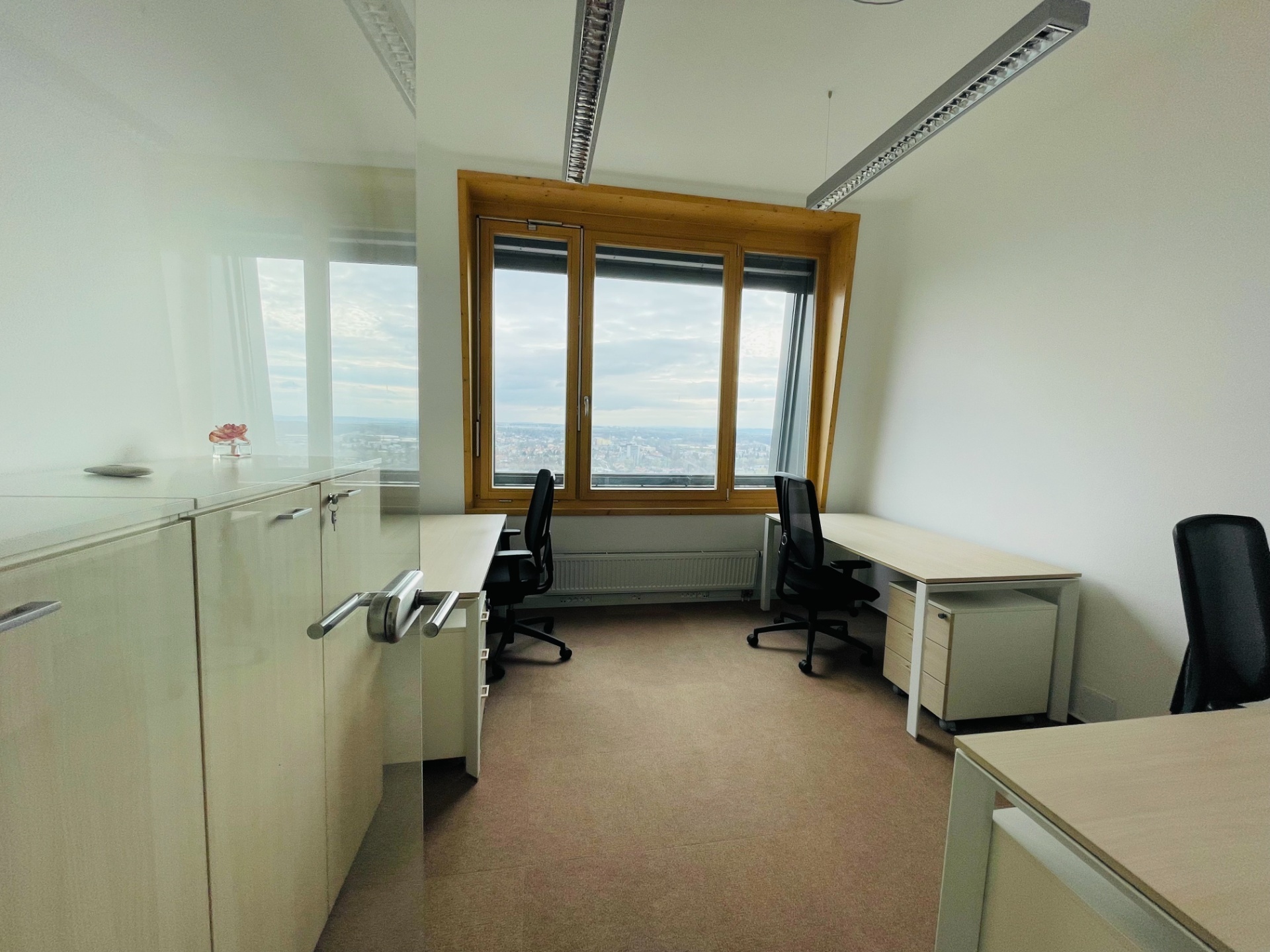 V zastoupení majitele nabízím exkluzivní prodej reprezentativní kanceláře ve 23. NP, s výhledem dosahujícím na Pálavu a to ve vyhledávané lokalitě, v prostorách nejvyšší budovy ČR - AZ Tower. Celková plocha kanceláře je 77 m², je rozdělena na čtyři místnosti, kuchyňský kout, koupelnu a WC (viz. přiložen půdorys).