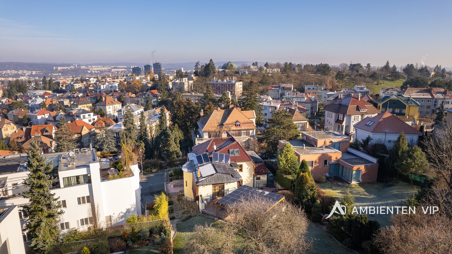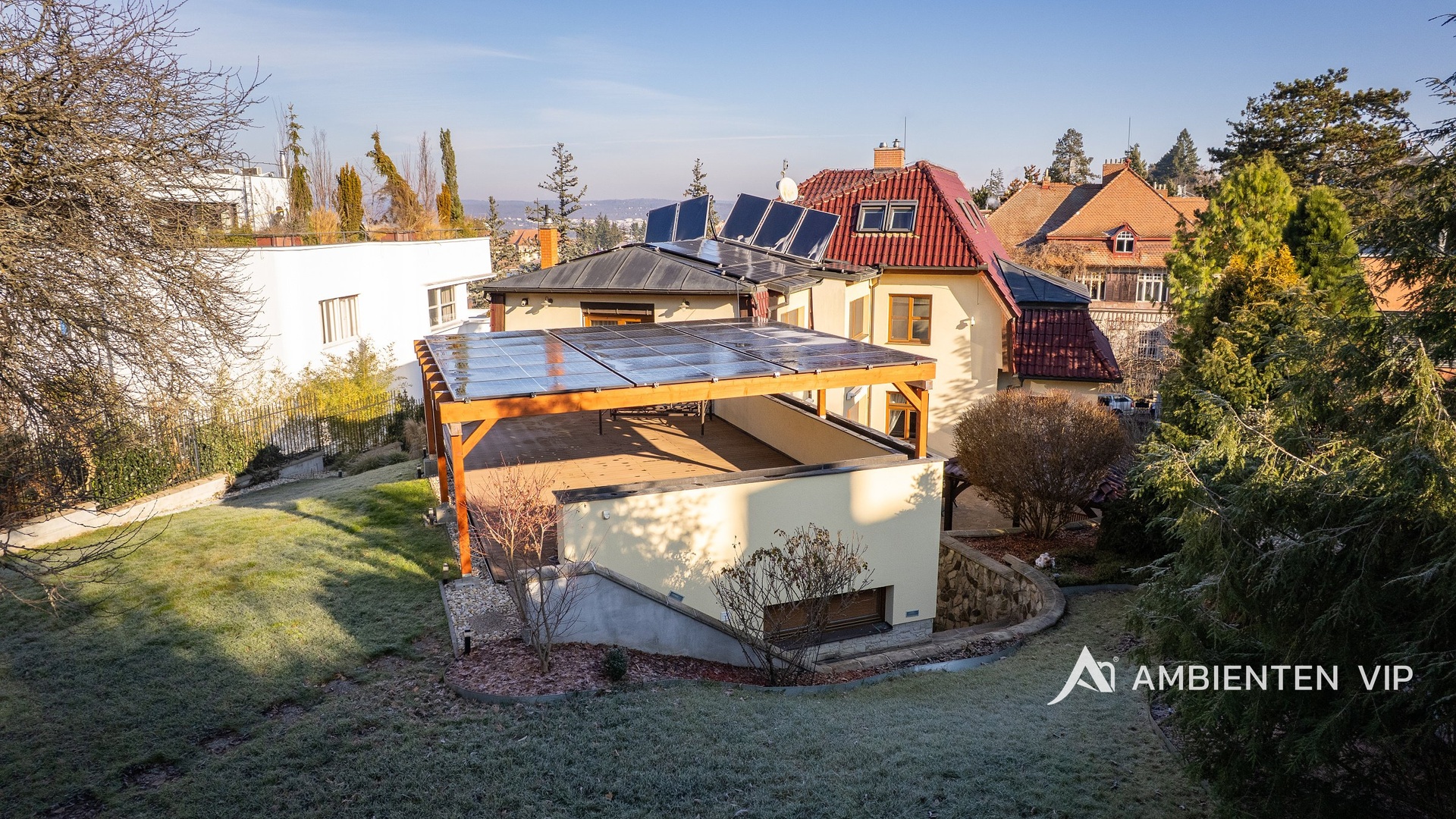Pokud hledáte samostatně stojící vilu v nejlukrativnější městské části ihned k nastěhování, tak tako vila je určena právě vám. Nachází se v bezprostřední blízkosti Kraví Hory v lokalitě, kde je perfektní dopravní obslužnost, nádherné parky, Wilsonův les, brněnské Planetárium, koupaliště, restaurace, kavárny, základní škola, mateřská škola, sportoviště. Vila je vybavena moderními technologiemi, je v perfektním technickém stavu bez nutnosti investic. Nadchne vás nejen svým umístěním, ale i perfektním provedením stavby, nad jehož realizací osobně dohlížel sám majitel, ale i precizností jakou byla provedena. Jsou zde použity nadstandardní materiály a v posledních letech byly zainvestovány velké finanční prostředky do FV elektrárny, chytré domácnosti, kamerového systému, v garáži je možné nabíjet dvě auta. Užitná plocha vč. teras a pakování před domem 754 m2, zastavěná plocha 339 m2, zahrada 984 m2, pozemek 1 323 m2. Nemovitost je o dispozici 6+kk s garáží pro dva vozy, která je průchozí do domu přes fitness, které lze také využít jako prostorný sklep na uskladnění vín. Dále je v suterénu vily technické zázemí, kde je kotelna s dvěma kotly. Vstupní 1. NP patro vily vás nadchne svojí honosností a vzdušností, kde je otevřená dispozice kuchyně, jídelny a obývacího pokoje s krbem, dále wellness zóna s bazénem, saunu a technické zázemí k nim. Dále samostatná toaleta a koupelna se sprchou a umyvadlem. Z tohoto patra máte přímý výstup do zahrady a na terasu vily. Ve 2. NP vily jsou celkem tři ložnice, prostorná koupelna s vanou, toaletou, umyvadly, samostatná šatna. Z hlavní ložnice vstupujete na terasu a do zahrady. Ve 3. NP je pracovna, pokoj pro hosty a koupelna se sprchou, umyvadlem a toaletou. Kompletní přestavba vily proběhla v letech 2002-2007. Okna vily jsou trojskla z exotického dřeva Meranti, mají vnitřní žaluzie a ložnice do zahrady má navíc venkovní žaluzii. Střešní okna jsou od firmy Velux s elektrickými žaluziemi. Podlahy ve vile jsou dubové v 1. NP vily a ve 2. NP vily plovoucí dřevěné. Technologické vybavení vily je systém inteligentní domácnosti, kamery, zabezpečovací systém, centrální vysavač a bazén je celý osvětlený s protiproudem. Kuchyňská linka a ostatní nábytek v domě byl realizován dle přání majitele na zakázku, vč. osvětlení a výmaleb. Kuchyně je vybavena spotřebiči Miele (elektrickou troubou, myčkou, konvektomatem, indukcí, ledničkou s mrazákem, vestavným kávovarem). Nemovitost má 4 zdroje vytápění. Lze topit krbem, plynovým kotlem, tepelným čerpadlem Wolf a klimatizací). V r. 2024 byla instalována fotovoltaická elektrárna Sunways o výkonu 12 kW (s 29 panely a úložištěm). Solární energií je vytápěn také podsvícený bazén (7,3 x 3,6 m) s protiproudem, automatickou filtrací a roletou. Dvůr s venkovním posezením, pergolou a krbem poskytuje absolutní soukromí. V rámci zahrady je umístěn zahradní domek s toaletou. Zahradu je zavlažována automatickým závlahovým systémem. Nemovitost je kompletně oplocena ploty z pozinku od uměleckého kováře. Doporučujeme vám prohlídku této skvostné vily.