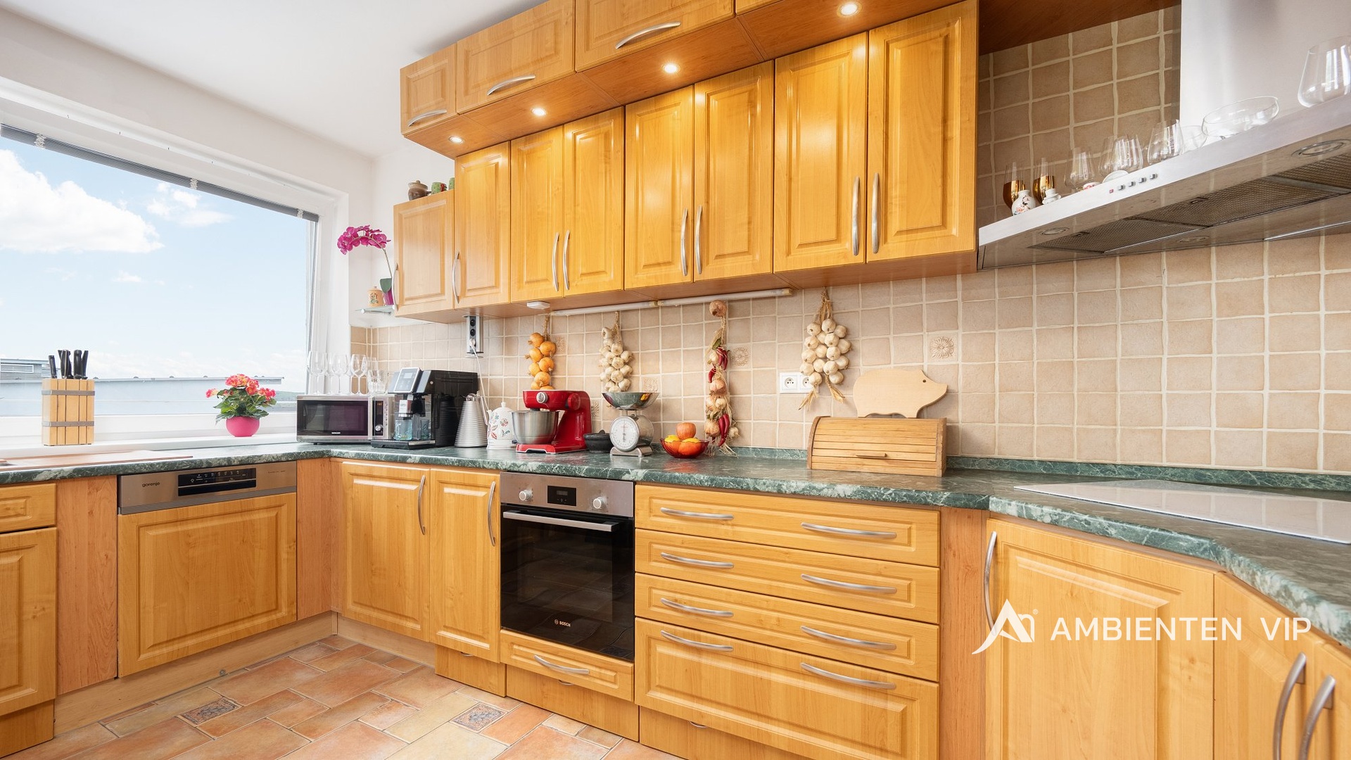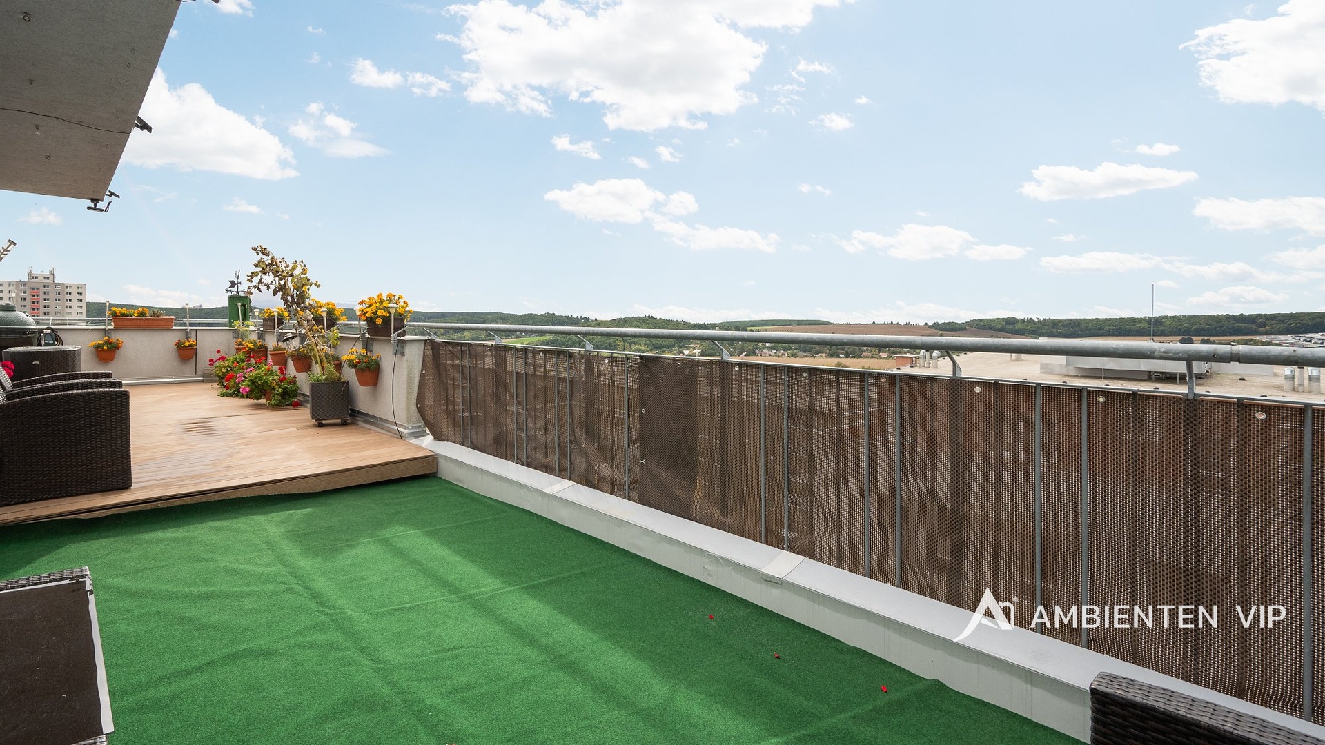 AMBIENTEN VIP si Vám dovoluje nabídnout ve výhradním zastoupení majitele mezonetový byt o dispozici 5+kk s celkovou plochou 180 m² včetně terasy 63,1 m² a balkónu 5,4 m². Užitná plocha samotného bytu činí 112 m², součástí je i sklepní jednotka 4,5 m² a dvě garážová stání které jsou zahrnuty v ceně. Nemovitost se nachází v žádané a klidné části Brna – Kamechy, Brno–Žebětín, v těsné blízkosti brněnské přehrady a přírodního parku Podkomorské lesy.