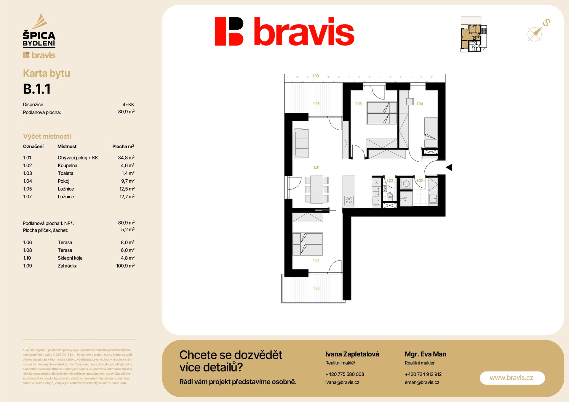 Byt (B.1.1) se nachází se jako jediný v 1. nadzemním podlaží nízkoenergetického bytového domu B a nabízí užitnou plochu 80,9m², která je promyšleně rozdělena do funkčních prostor: