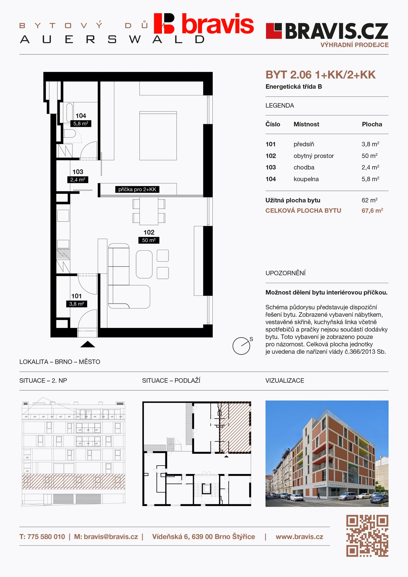 Prodej moderního ateliéru 2+kk (67,6 m2) v novostavbě, blízko centra, Zábrdovice: Auerswaldova, možn
