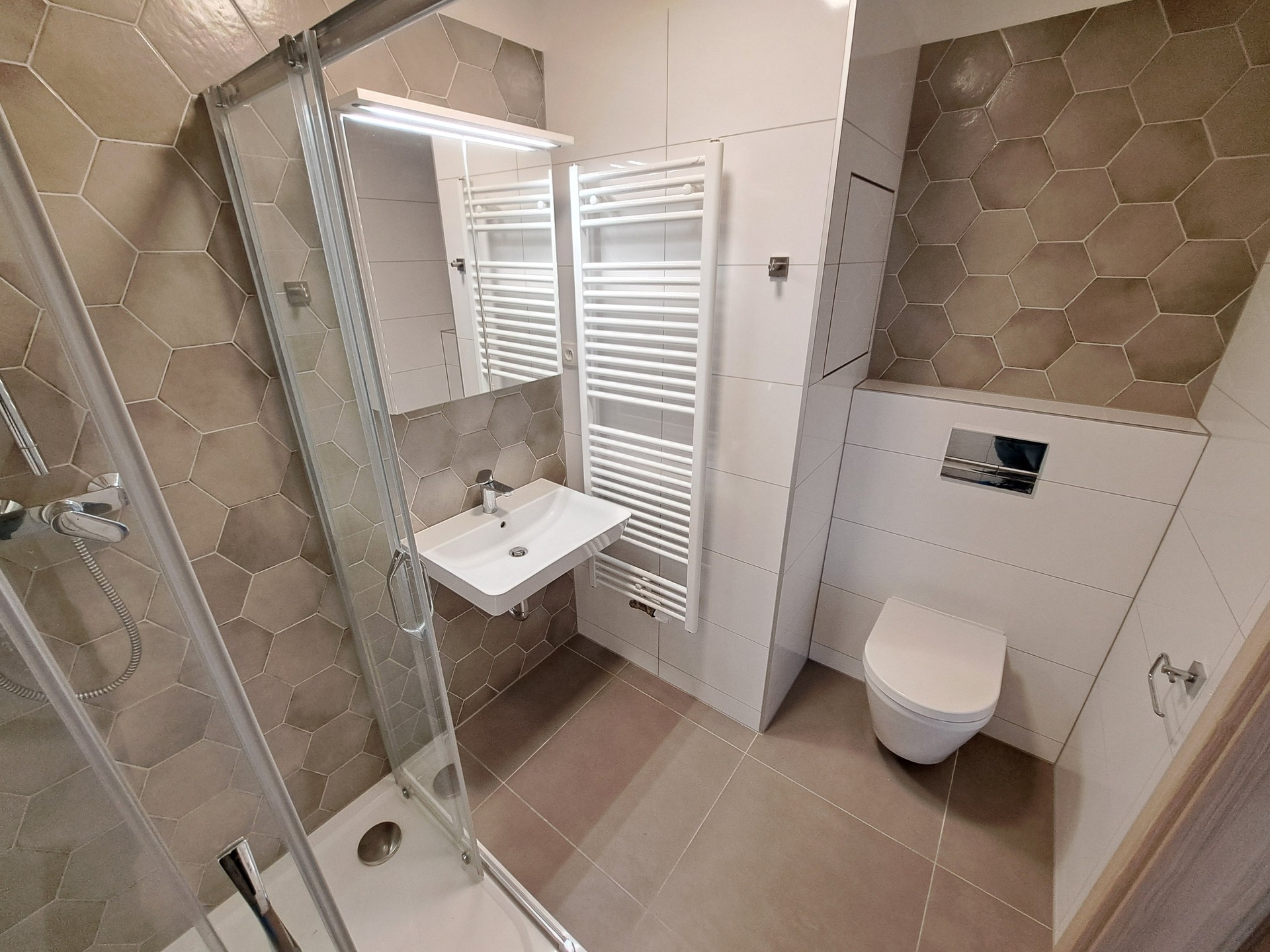 Pokoj s kk - kuchyňská linka se spotřebiči (indukční varná deska, digestoř, elektrická trouba, MV trouba, myčka, dřez, baterie, lednice s mrazákem); vstupní hala - vestavěné skříně, věšáková stěna; koupelna s WC - sprchový kout, umyvadlo, zrcadlová skříňka, závěsné WC, topný žebřík; systém rekuperace vzduchu v budově (probíhá výměna vzduchu i při zavřených oknech a teplota je ovládána vlastním termostatem v každém pokoji), osvětlení.