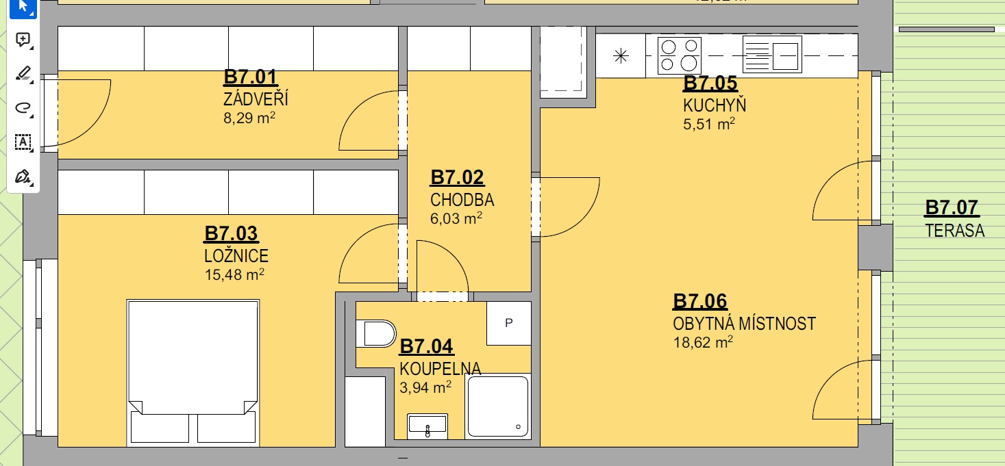 Vstupní hala (8,3 m²), obývací pokoj s kuchyňským koutem (24,1 m²) s východem na terasu (9,8 m²), pokoj (15,2 m²), chodba, koupelna s WC , sklep.