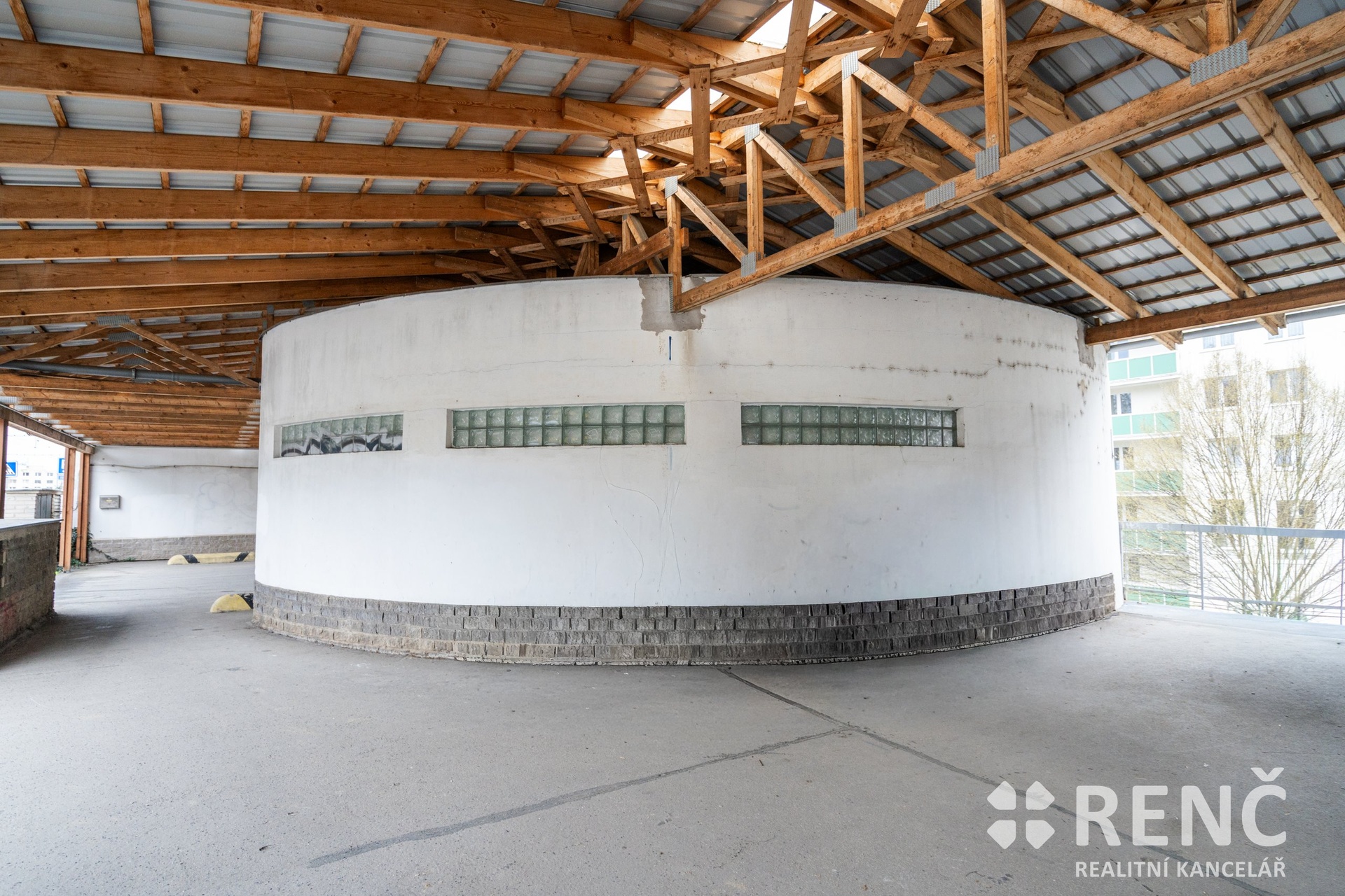 Garáž má atypický půlkruhový tvar (zadní stěnu tvoří oblouk).