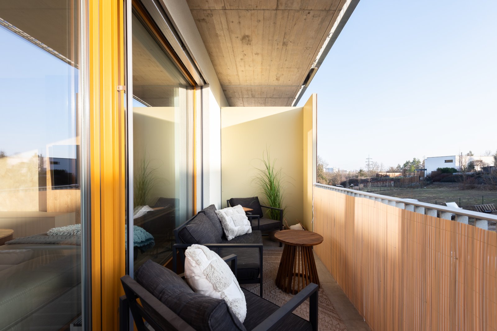 Východně orientovaná ložnice (12m2) s vestavěnou skříní a pracovním stolem nabízí příjemné ranní sluníčko a nádherný výhled do lesa. Dětský pokoj (14m2) je orientovaný na severní stranu a výhled má taktéž do zeleně. Komora (5m2) přímo na patře ihned vedle bytu, ideální pro pohodlné parkování kočárku, kol či jako rozšířená spižírna.