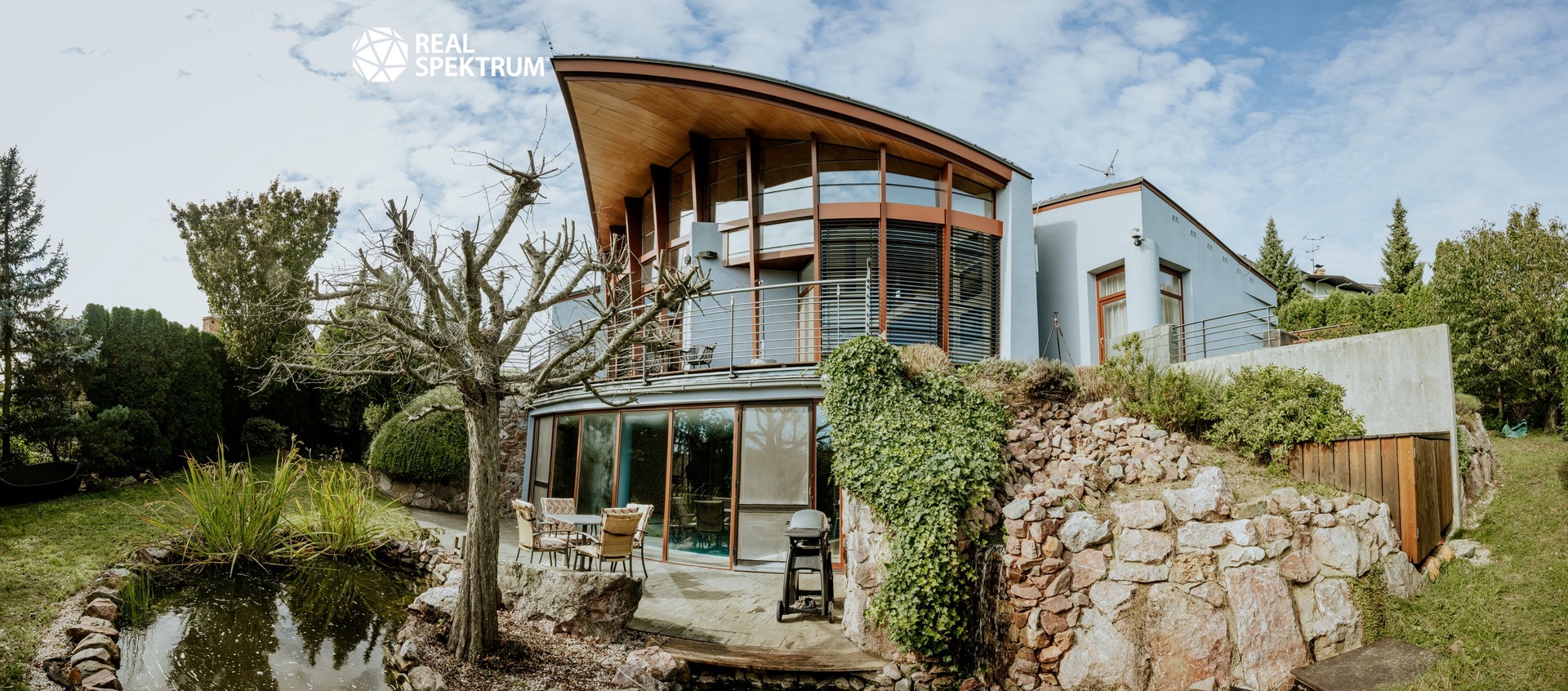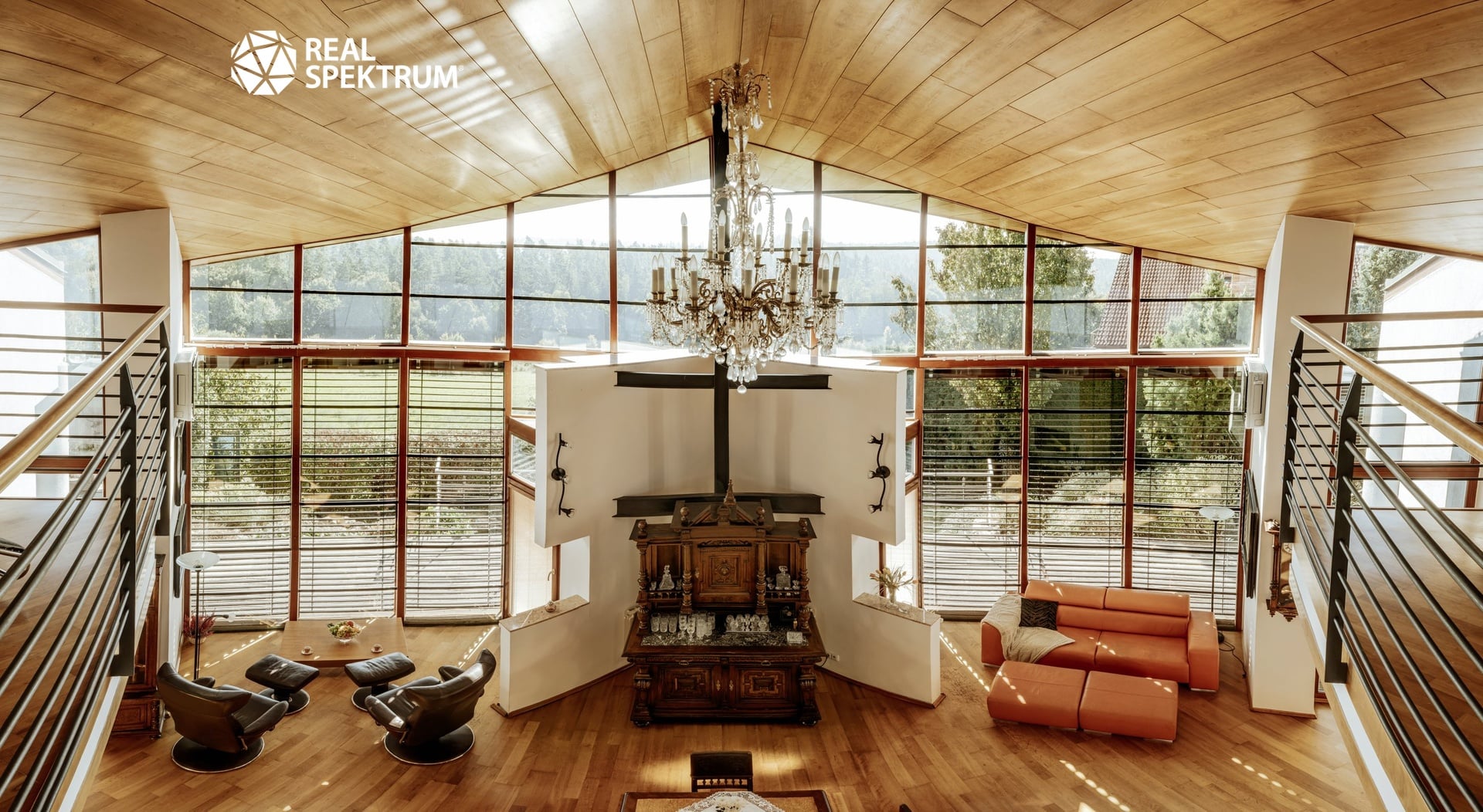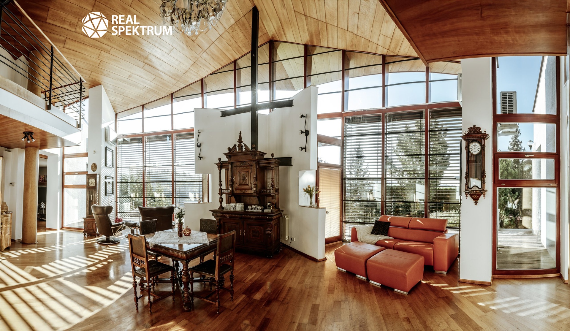Dům nabízí velkorysý obytný prostor s řadou dominantních prvků - vysoké stropy, prosklené štíty a velká okna, krb a kombinace moderních a dobových prvků. Pro stavbu byly použity pouze nadstandardní materiály jako je například onyx nebo masiv (kanadská třešeň).