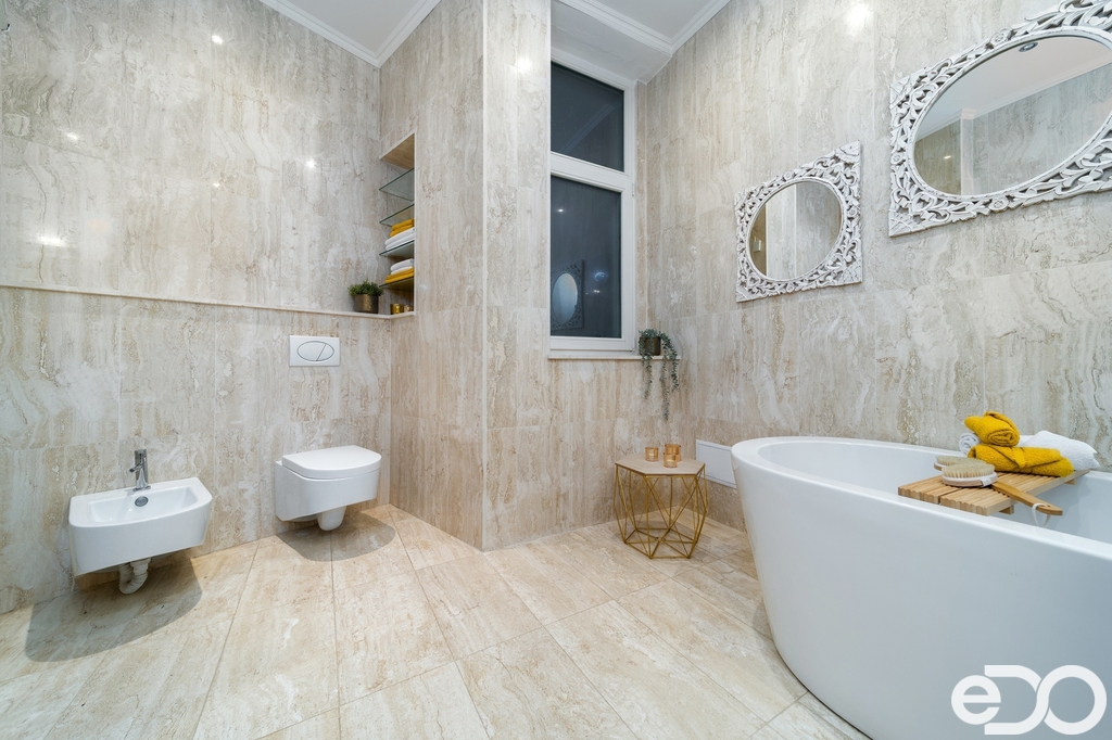 Koupelna je provedena z kvalitních materiálů, s podlahovým vytápěním pro maximální tepelný komfort. Podlahové topení je instalováno také v pokoji do vnitrobloku pod novou dlažbou.