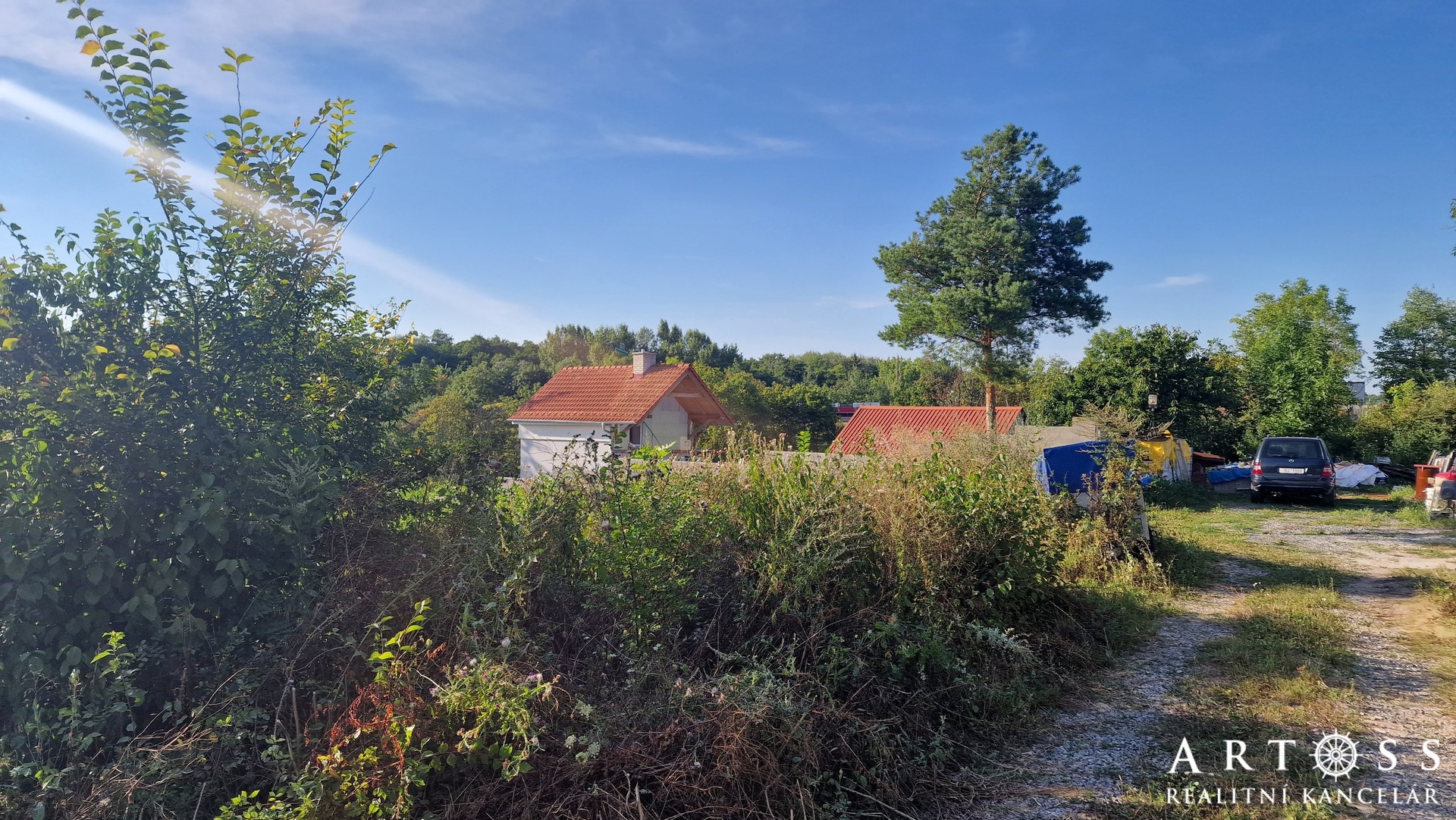 Pozemek je v současné době neudržovaný, zarostlý plevelem a náletovými dřevinami. Betonová zeď na levé straně je součástí pozemku, stejně jako nezpevněná cesta, která je zobrazená na přiložených fotografiích. K dispozici je také přístup ze zadní strany po polní cestě. Na pozemku se nachází vrtaná studna s atestem potvrzujícím kvalitu pitné vody. Přípojka elektřiny je na hranici pozemku.