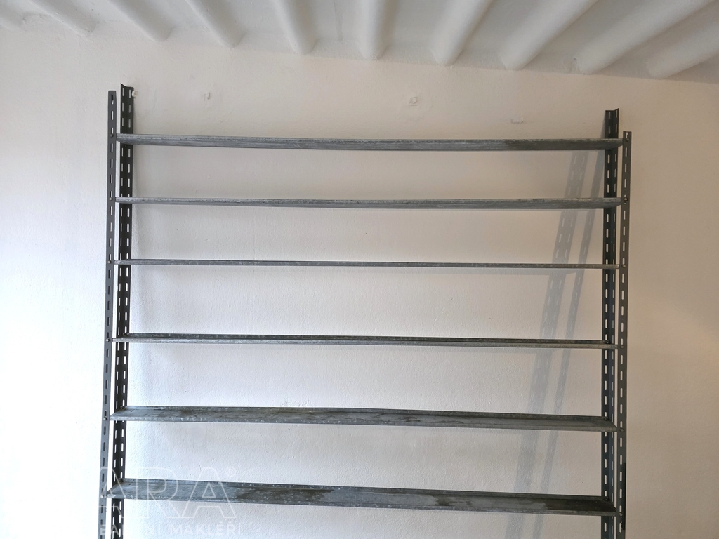 Součástí prodeje je bytelný nerezový ponk, vnitřní dřevěná konstrukce pro zavěšení věcí (demontovaná) a regál.