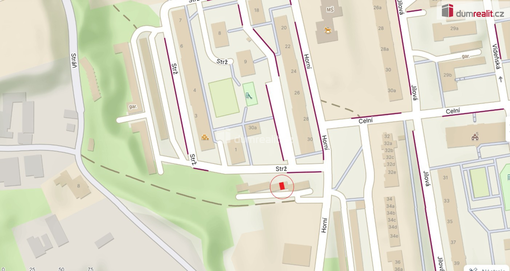Budova řadových garáží je samostatnou stavbou, nacházející se na spojnici ulic Horní a Strž.