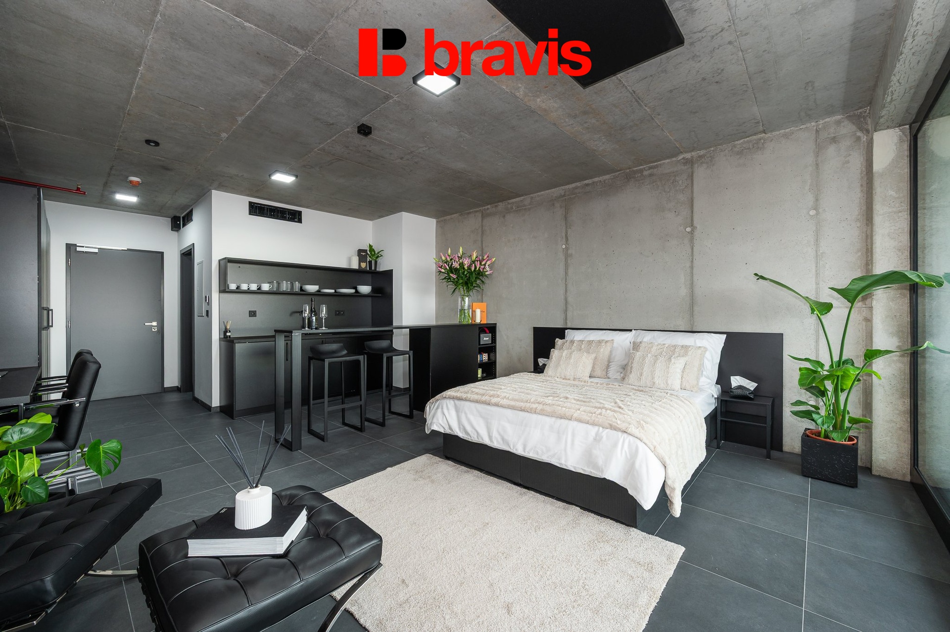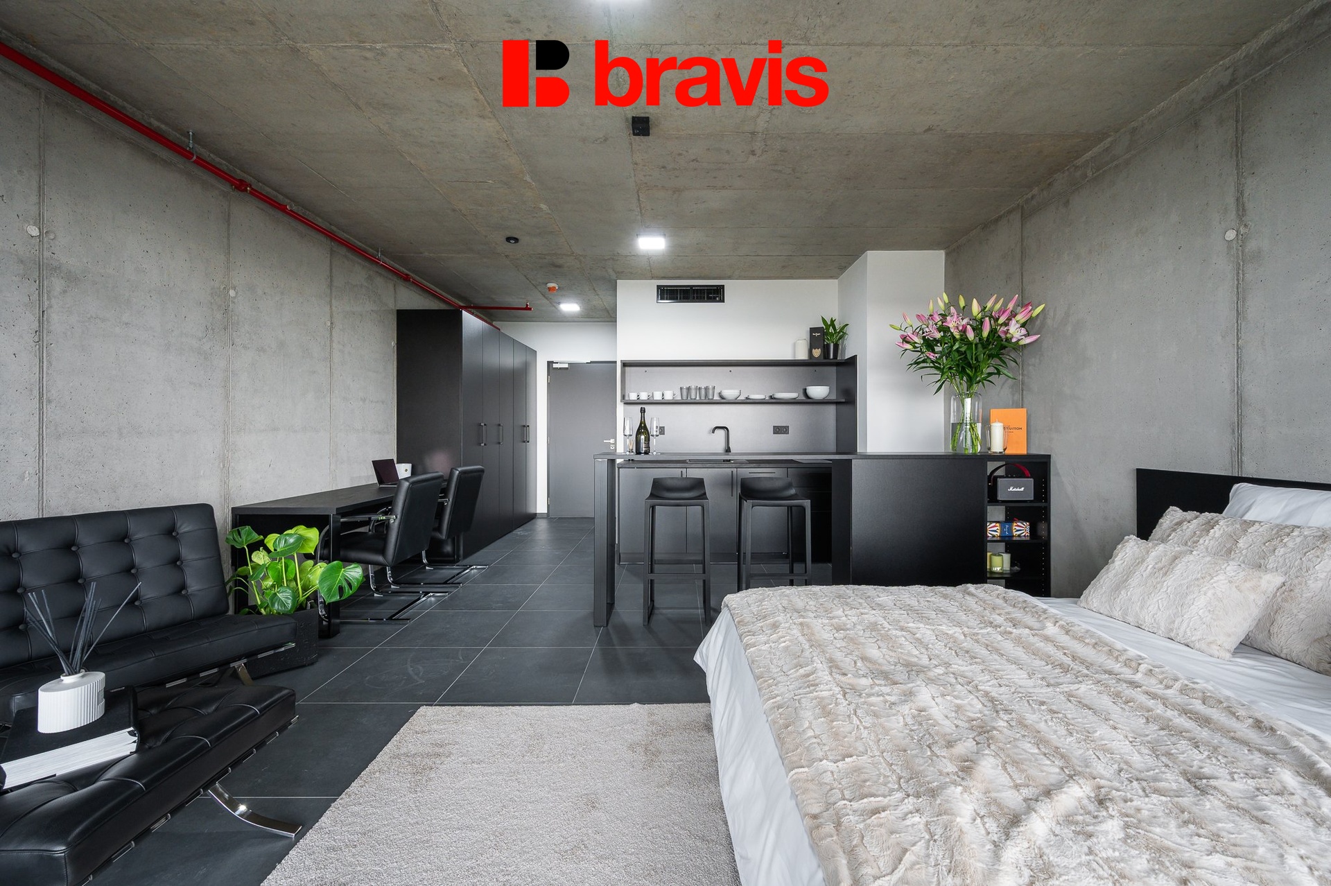 • Obytná část: Dominantou prostoru je ikonické křeslo Barcelona, doplněné o pohodlnou postel (160x200 cm) včetně lůžkovin. Pro vaši práci i relaxaci je připraven pracovní stůl, šatní skříně s velkým úložným prostorem a barový pult pro ranní kávu.