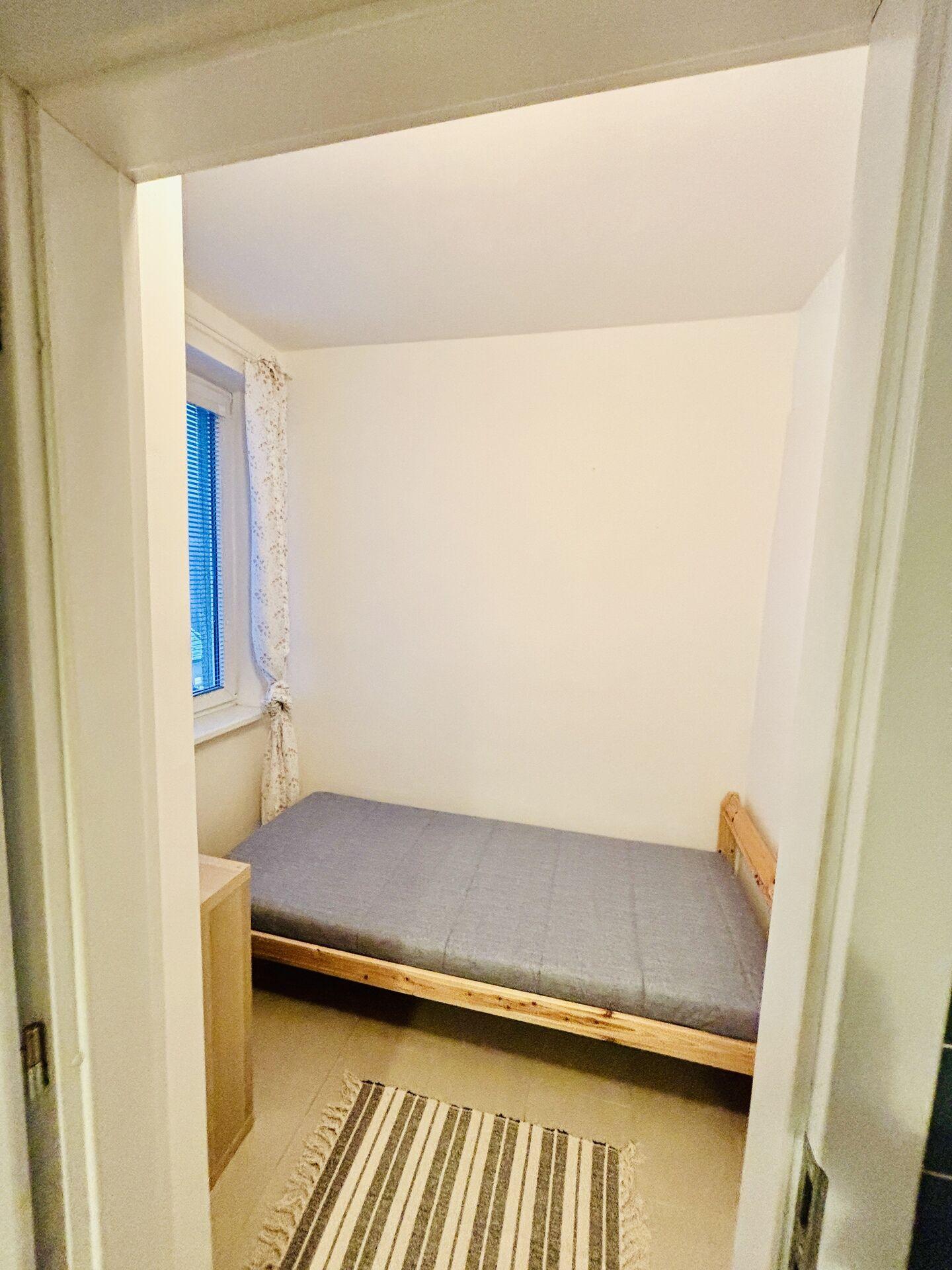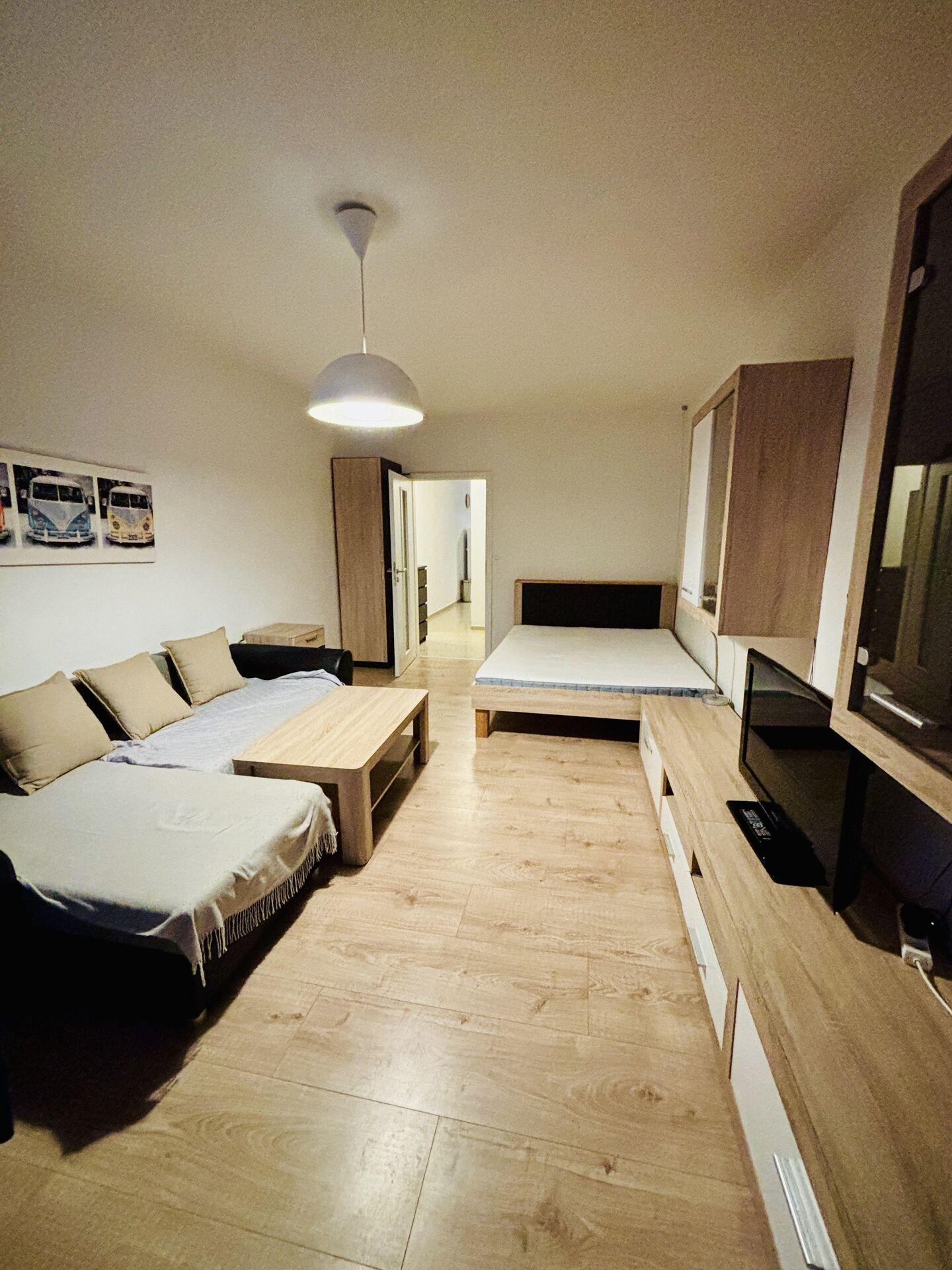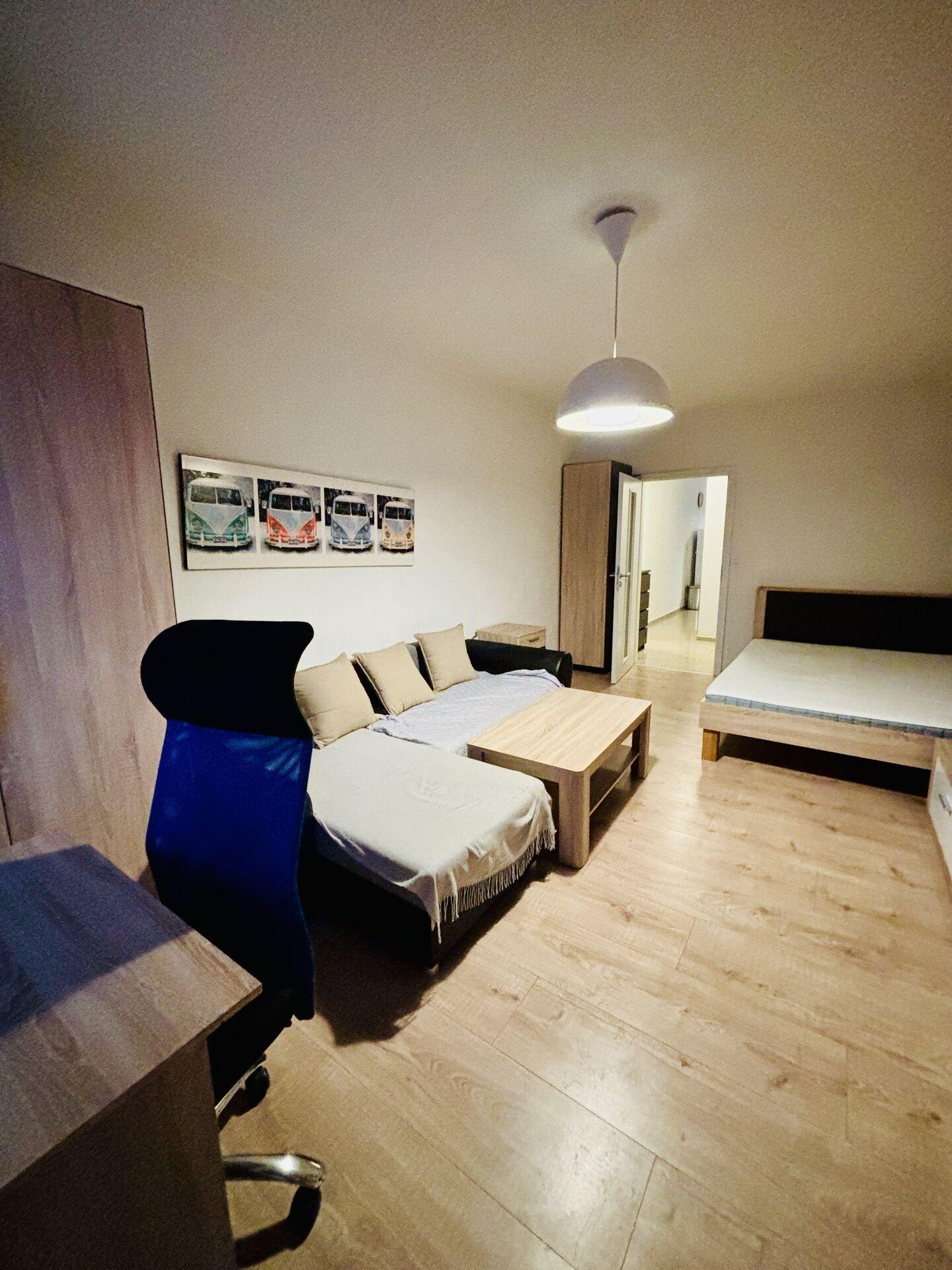 Byt se nabízí vybavený, jeden pokoj se nachází za kuchyní, kde je postel a je menší. Druhý pokoj je s balkonem, vybaven nábytkem, dvoulůžkovou postelí, televizí, psacím stolem se židlí.