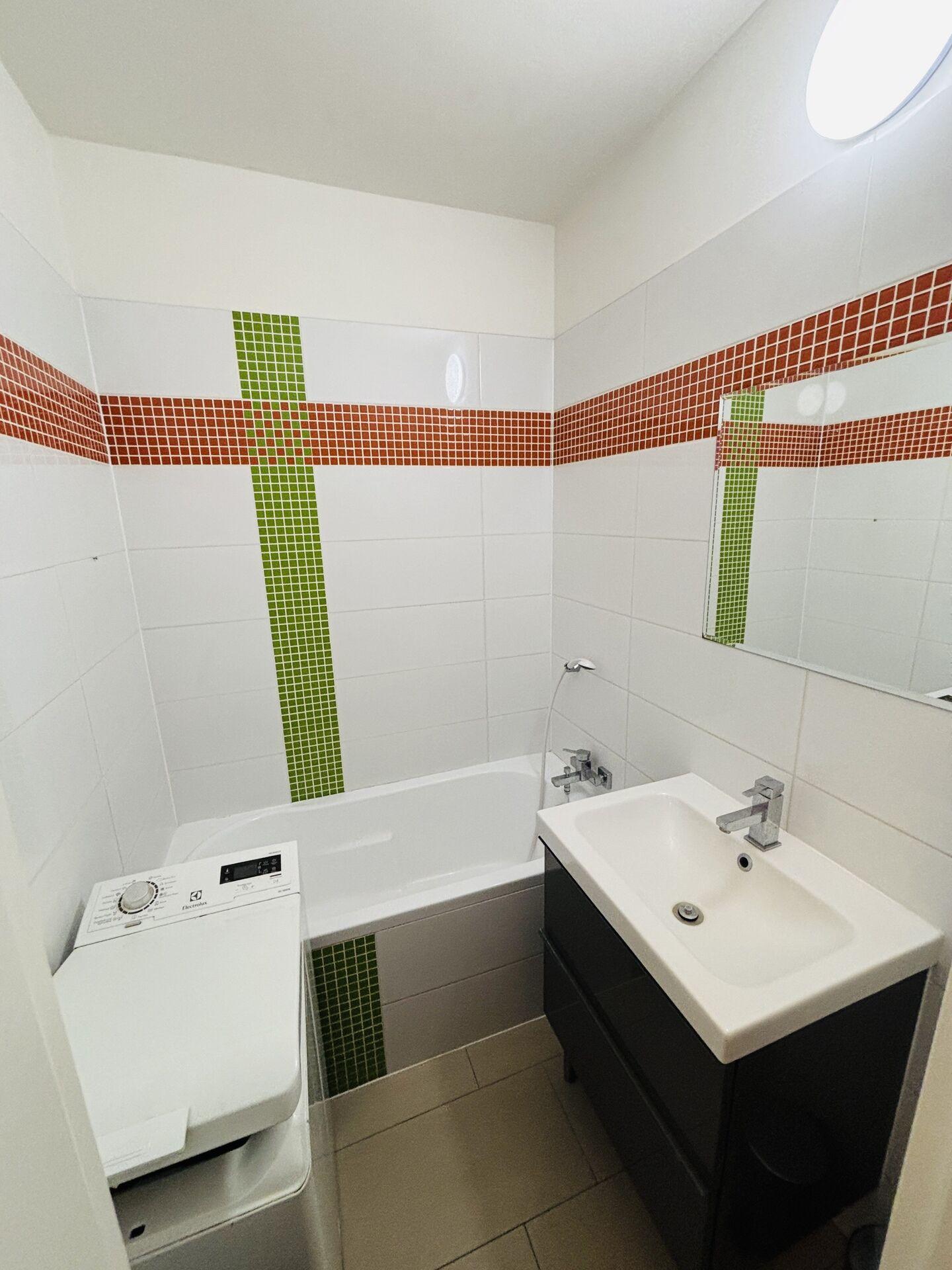 Součástí koupelny je vana, umyvadlo a pračka. Toaleta je oddělená.