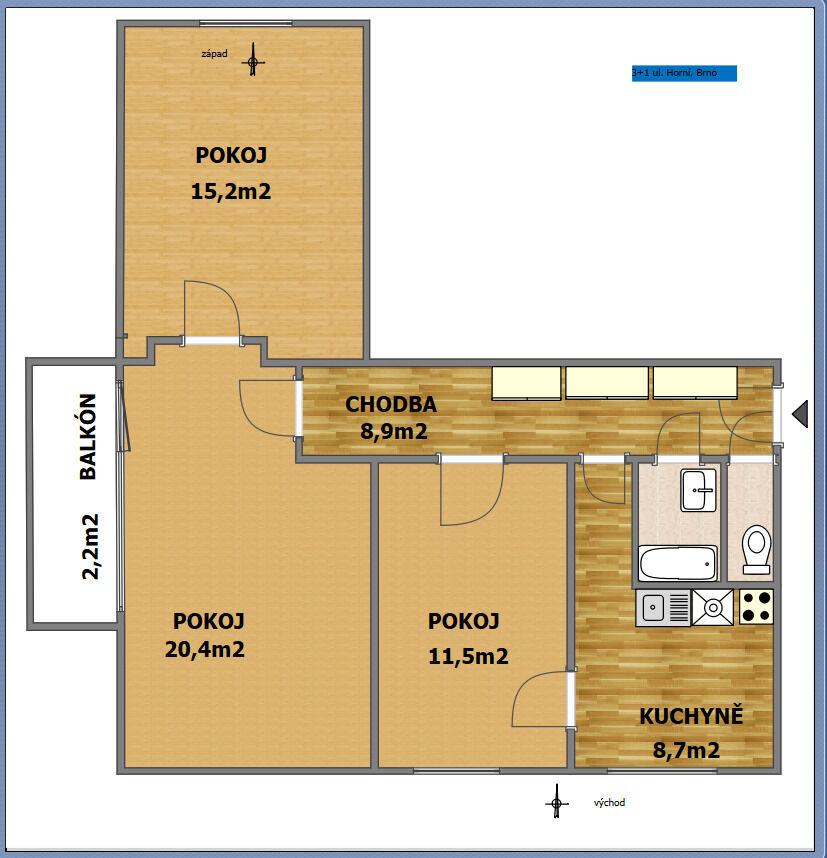 kuchyň 8,7 m2 a pokoj 11,5 m2 směrem k východu, pokoj 20,4 m2 s balkonem 2,2 m2, pokoj 15,2 m2 směrem k západu, chodba 8,9 m2, samostatná koupelna s vanou 2,3 m2, WC 0,8 m2.