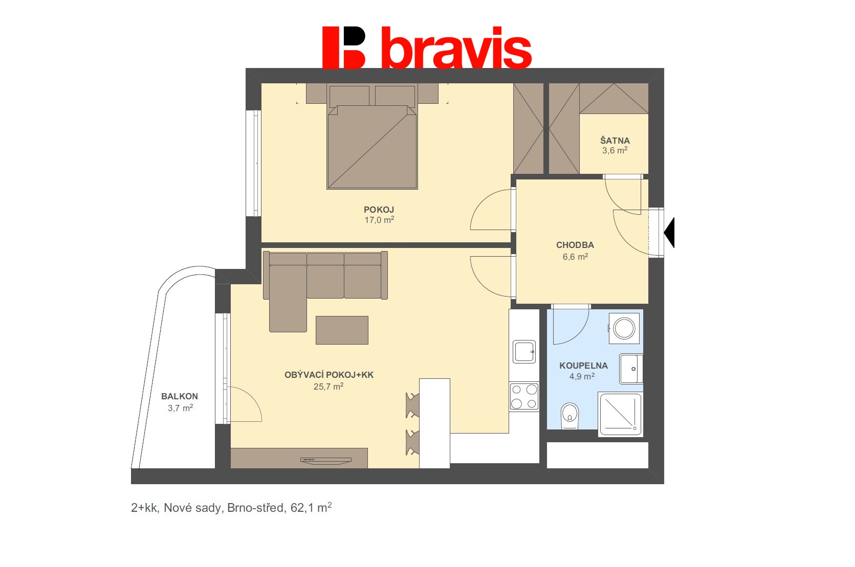 Byt 2+kk o celkové podlahové ploše 62 m2 + lodžie a sklep se nachází ve 4.patře.
