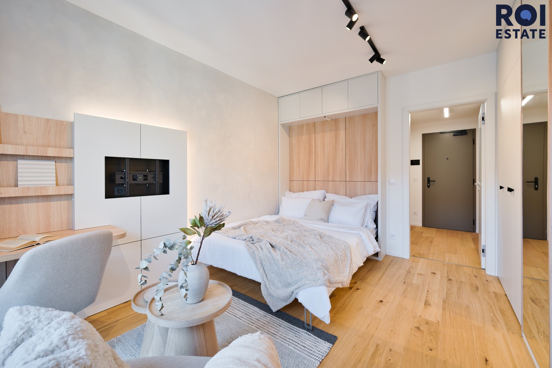 Interiér působí lehce, harmonicky a příjemně teple díky kombinaci přírodního dřeva, světle šedých tónů a jemného ambientního osvětlení. Kuchyňská linka je plně vybavená vestavnými spotřebiči, nechybí indukční varná deska, trouba, digestoř ani chladnička. Promyšlené úložné prostory přirozeně navazují na obytnou zónu s pracovním koutem, který působí elegantně i prakticky zároveň.